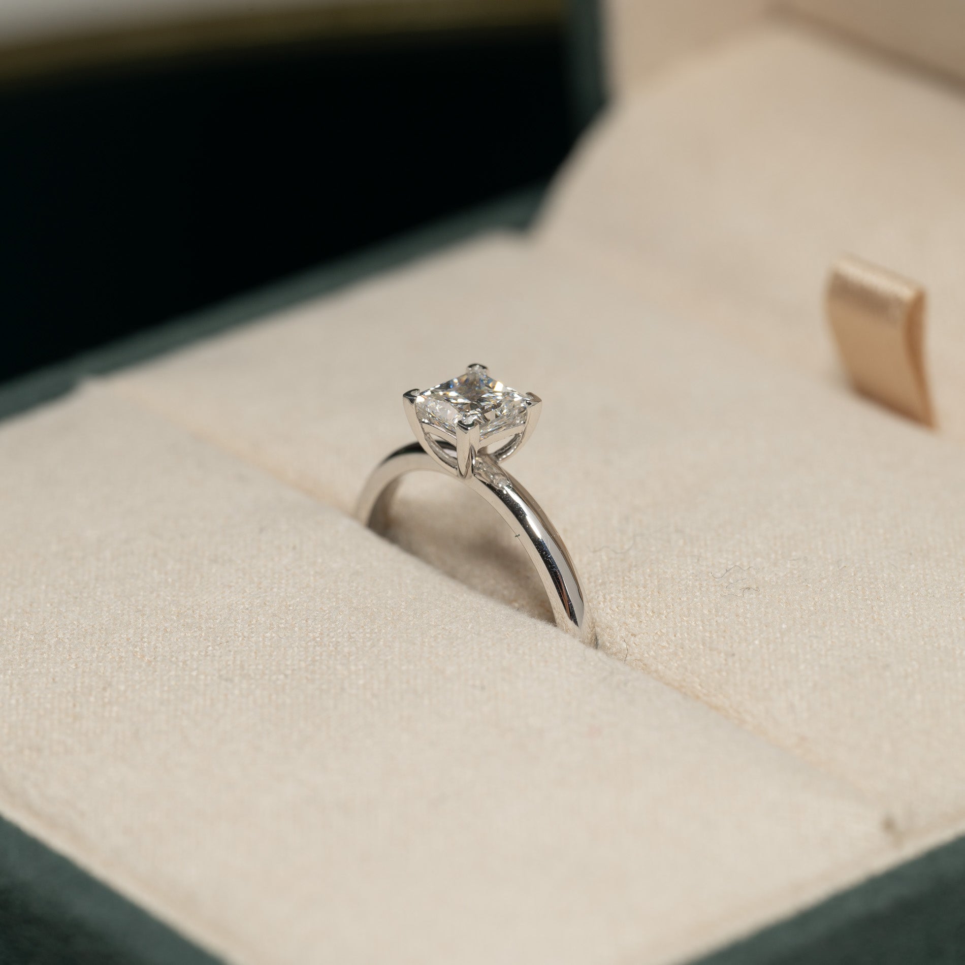 Ringen er laget i 14 karat massivt hvitt gull med en etisk skapt lab-grown diamant som har en vekt på ca. 0,75 ct. (+/- 0,02 ct.). Diamanten har fargen G (top Wesselton) og klarhet VVS-VS. Utover det er den fremstilt CO2 nøytralt med 100% grønn energi, og gullet er 100% sertifisert gjenvunnet.