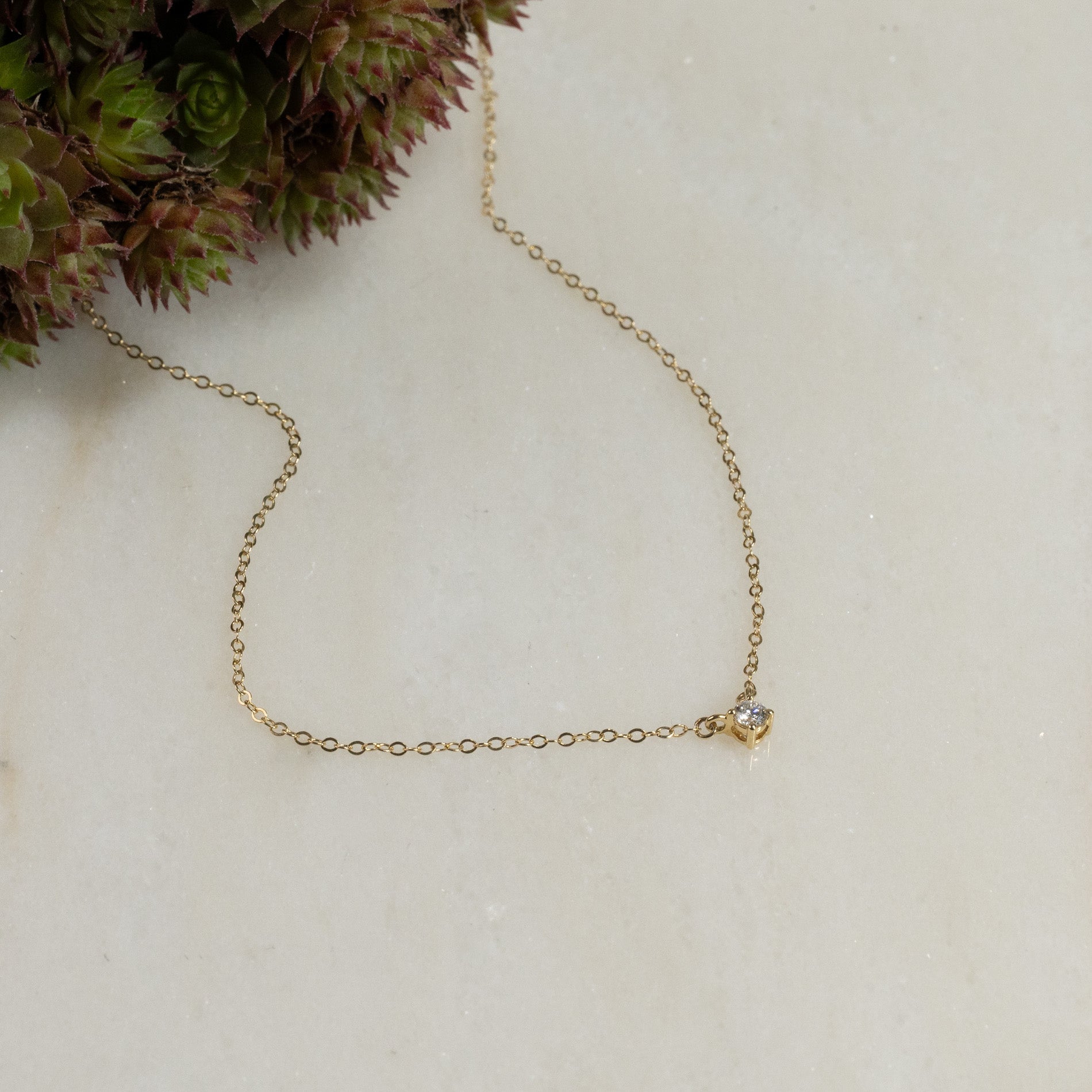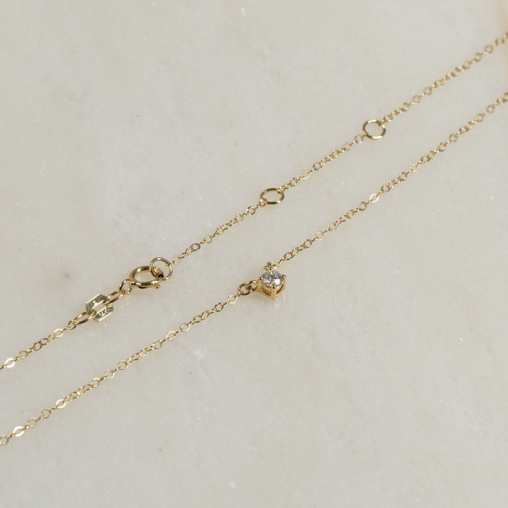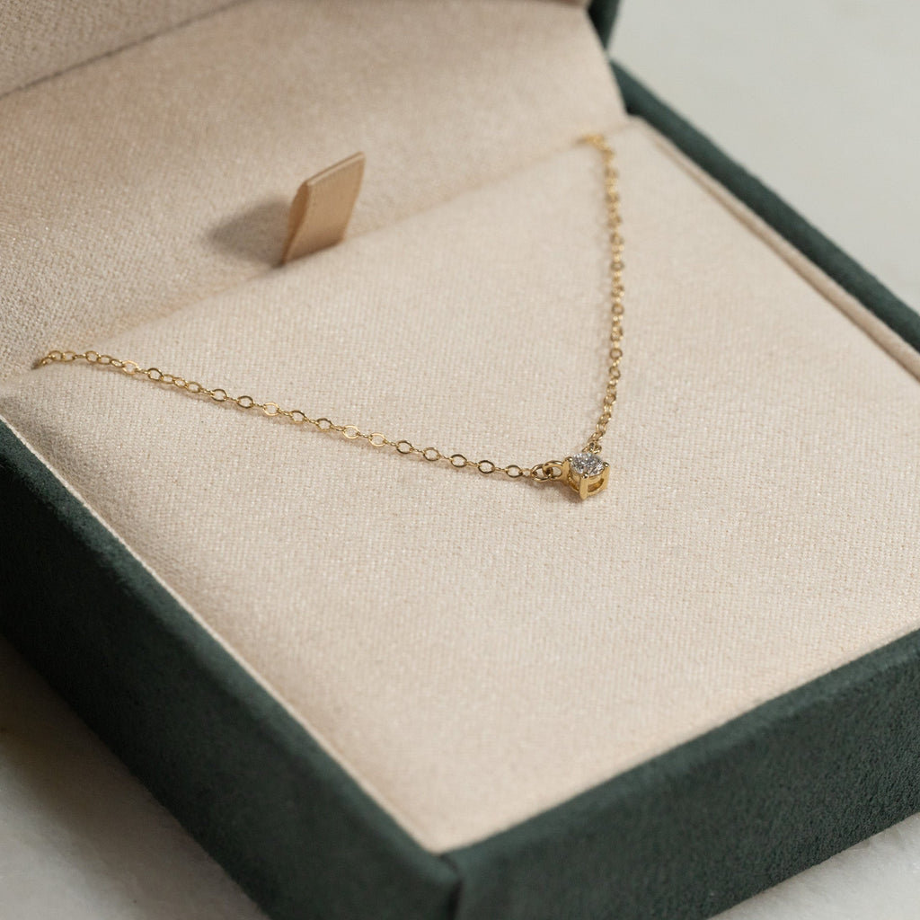 Halskjeden er laget i 14 karat massivt gull med en etisk skapt lab-grown diamant som har en vekt på 0,1 ct. (Ø: 3 mm). Diamanten har fargen E/F (River/Top Wesselton) og klarheten VVS-VS. Diamanten er skapt med grønn energi - hovedsakelig fra solenergi. Gullet er sertifisert 100% resirkulert.
