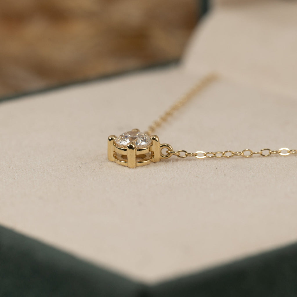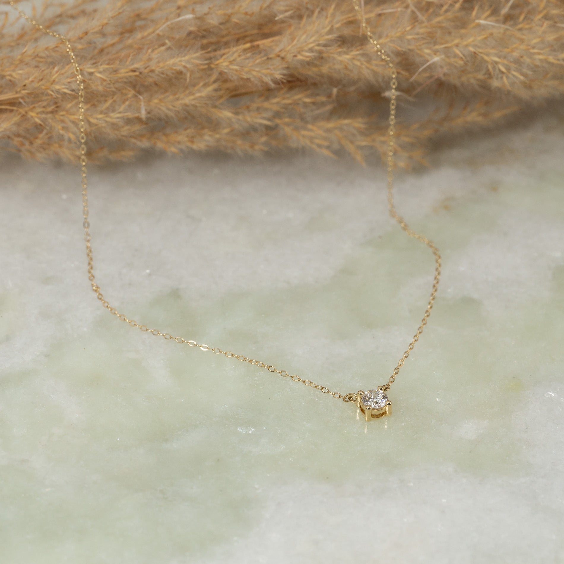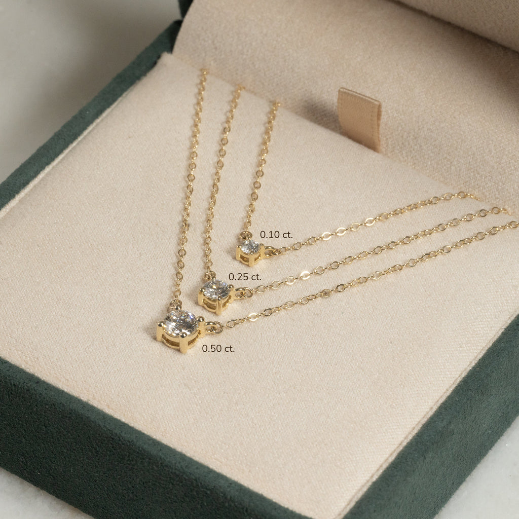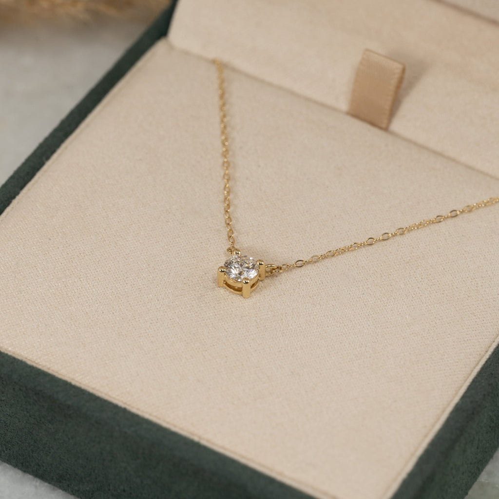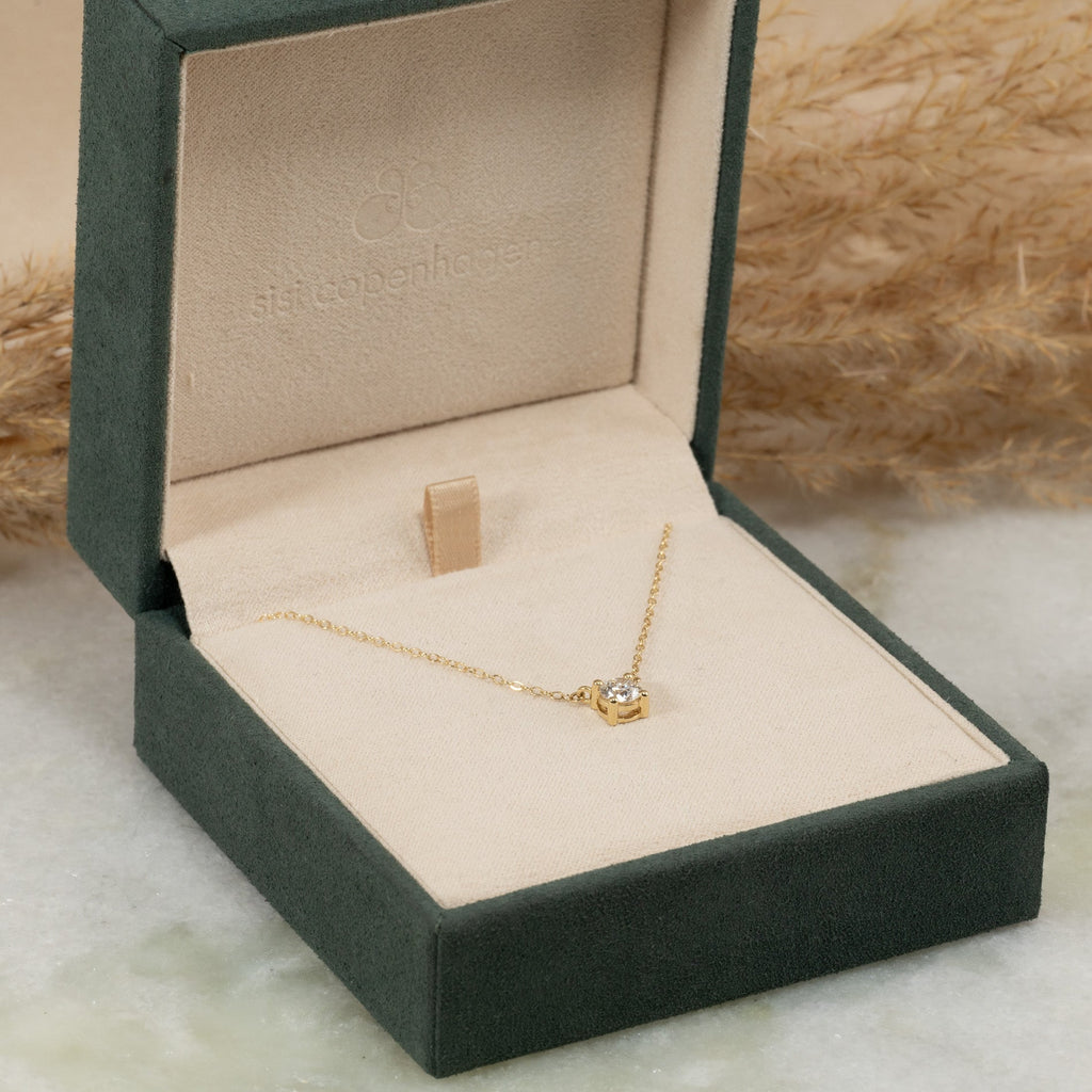Halskjedet er laget i 14 karat massivt gull med en etisk produsert laboratorie dyrket diamant som har en vekt på 0,5 ct. (Ø: 5 mm). Diamanten har fargen E/F (River/Top Wesselton) og klarheten VVS-VS. Diamanten er skapt med grønn energi – primært fra solenergi. Gullet er sertifisert 100% resirkulert.