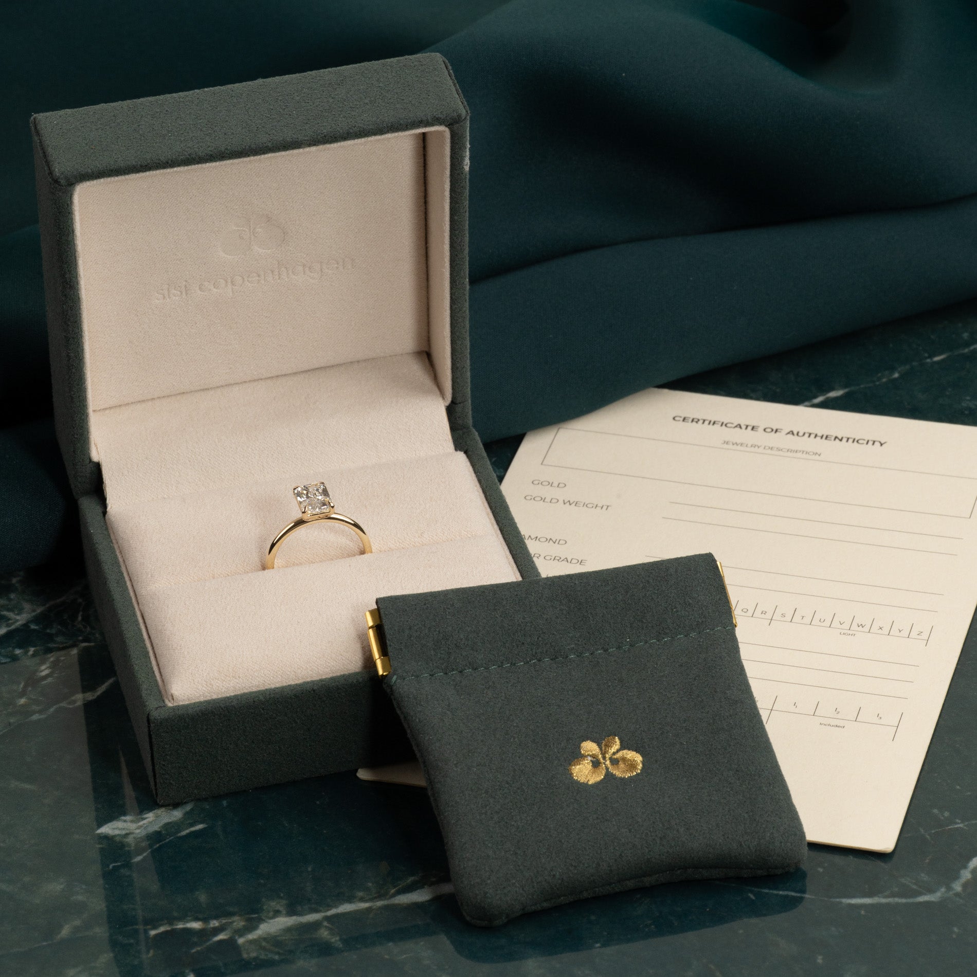 Når du mottar smykket, vil det være i vår gaveeske, bundet med et vakkert matchende silkebånd, klar til å gis som gave. Inne i esken finner du en smykkeboks, en pose og et ekthetsbevis.