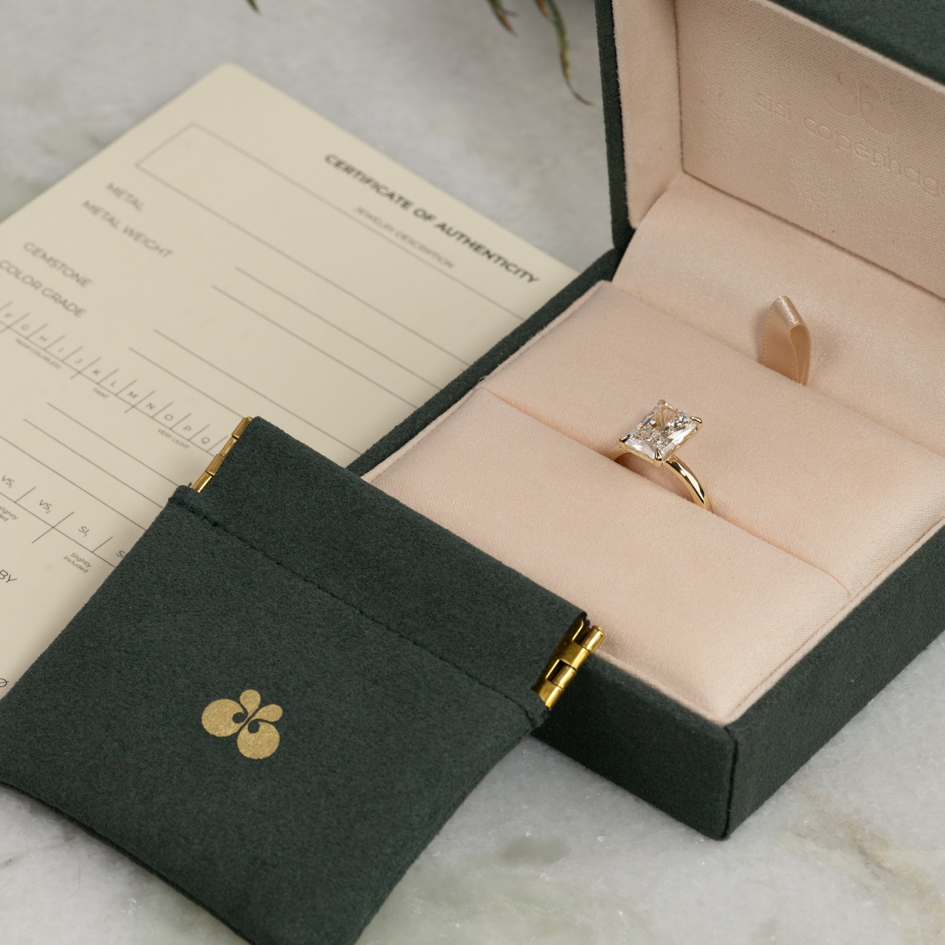 Smykket leveres i vår eksklusive Diamond Collection boks med en vakker smykkeeske, sertifikat og pouch. Boksen leveres med gavebånd og er perfekt dersom ringen skal gis i gave. Diamanten leveres med IGI sertifikat.