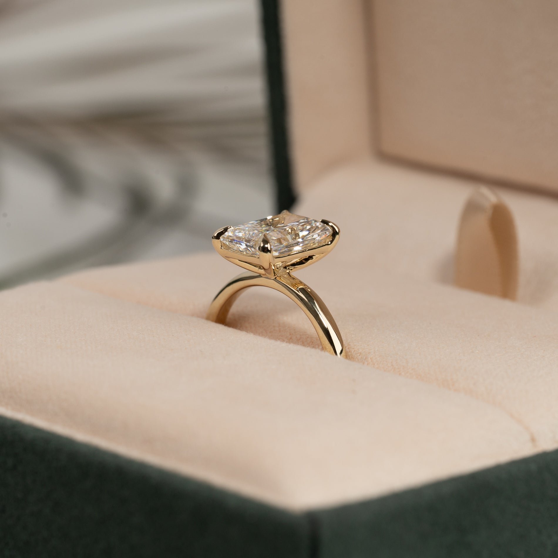 Ring i 14 karat massivt gull med en 3,0 ct radiant slipt laboratorieskapt diamant. Stenen er vakkert satt i en lett hevet basket innfatning som fremhever den elegante formen. Ringen passer perfekt som cocktailring, som en gave til en du er glad i, eller som en eksklusiv forlovelsesring.