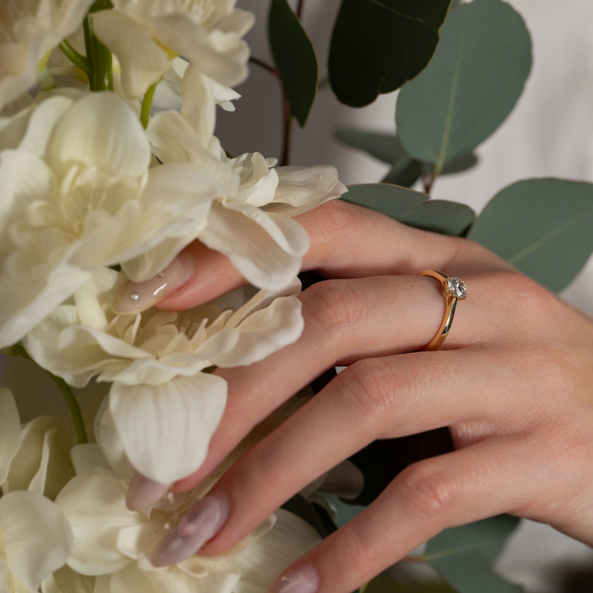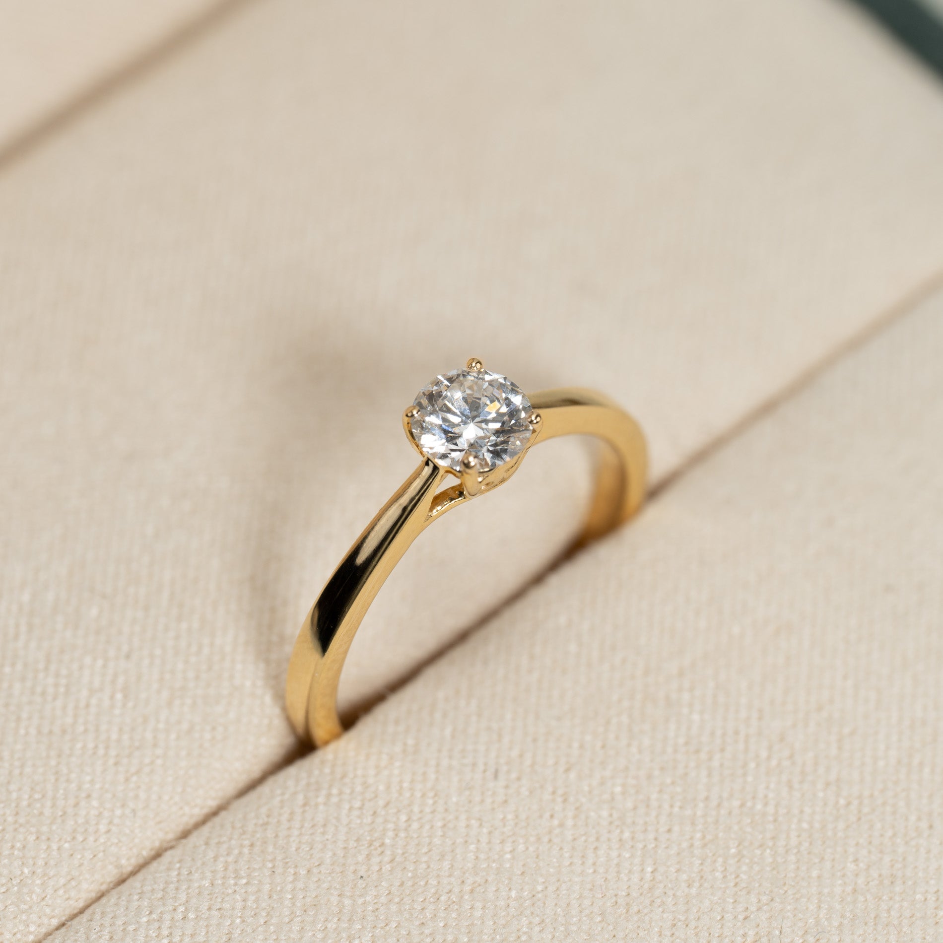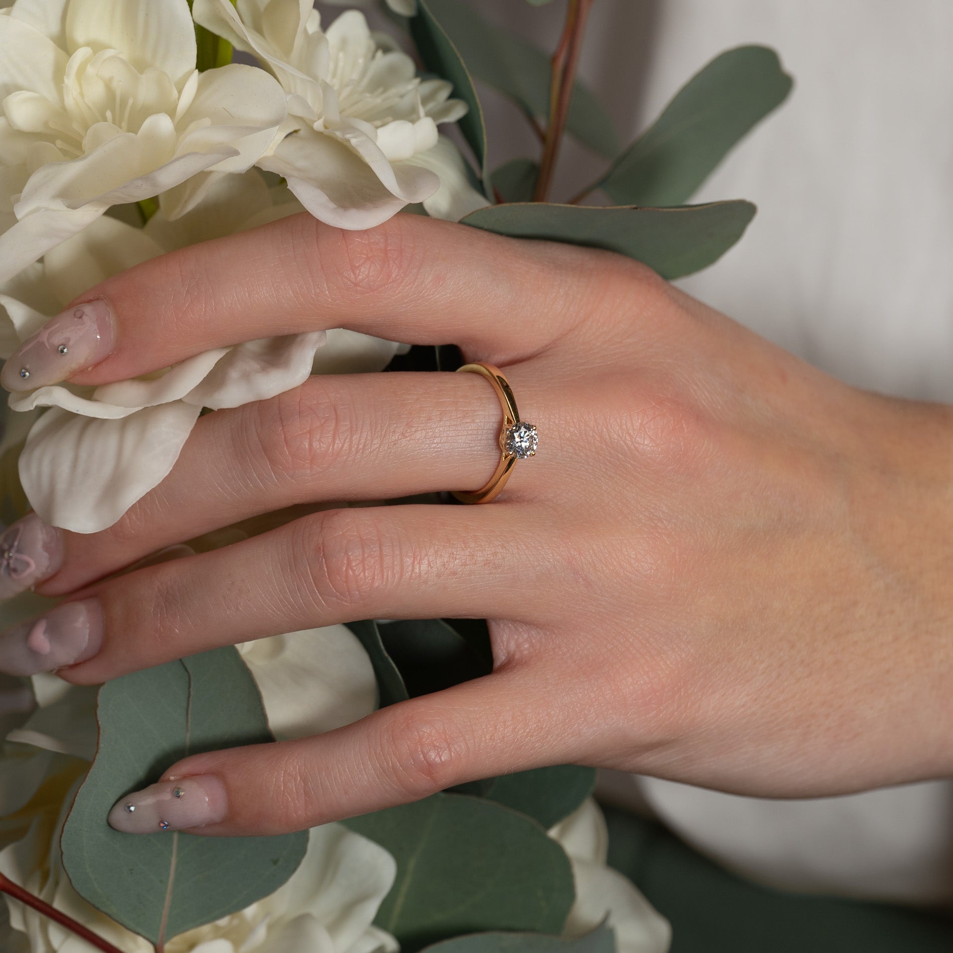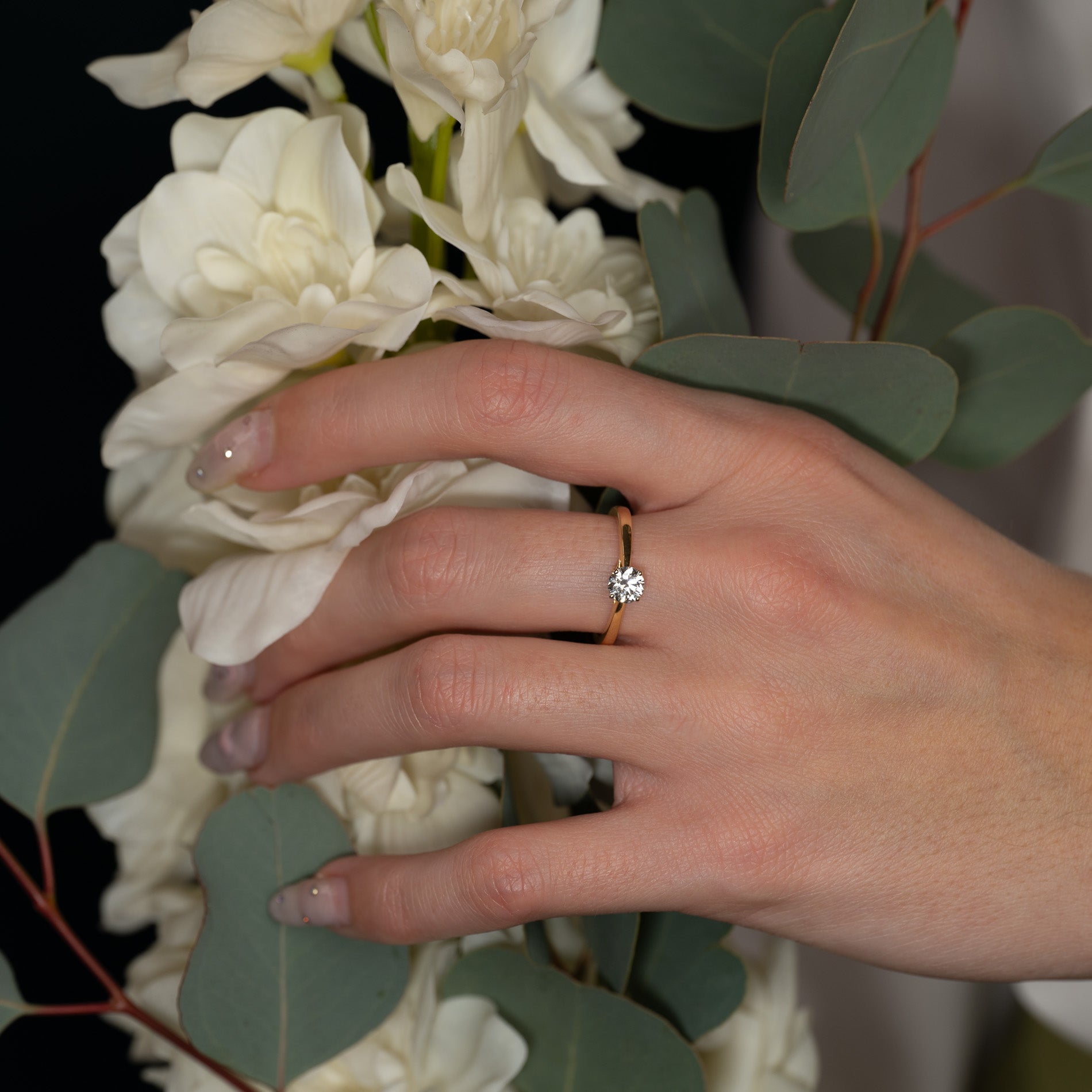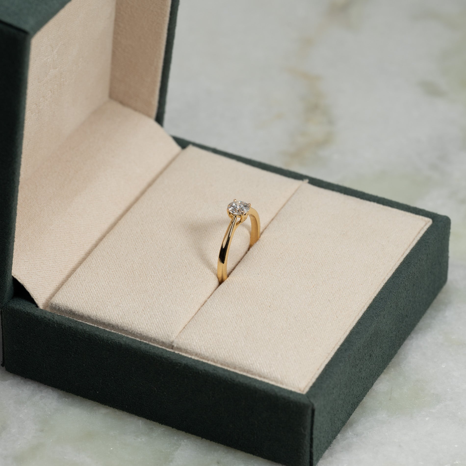 Ringen er laget i 14 karat massivt gull med en lab-grown diamant som har en vekt på 0,55 ct. (Ø5,1mm). Diamanten er briljanslipt (rund), og har fargen E/F (River) og klarhet VVS. Smykket er skapt med omtanke; diamantene er produsert med blant annet solenergi, og gullet er 100% sertifisert resirkulert.
