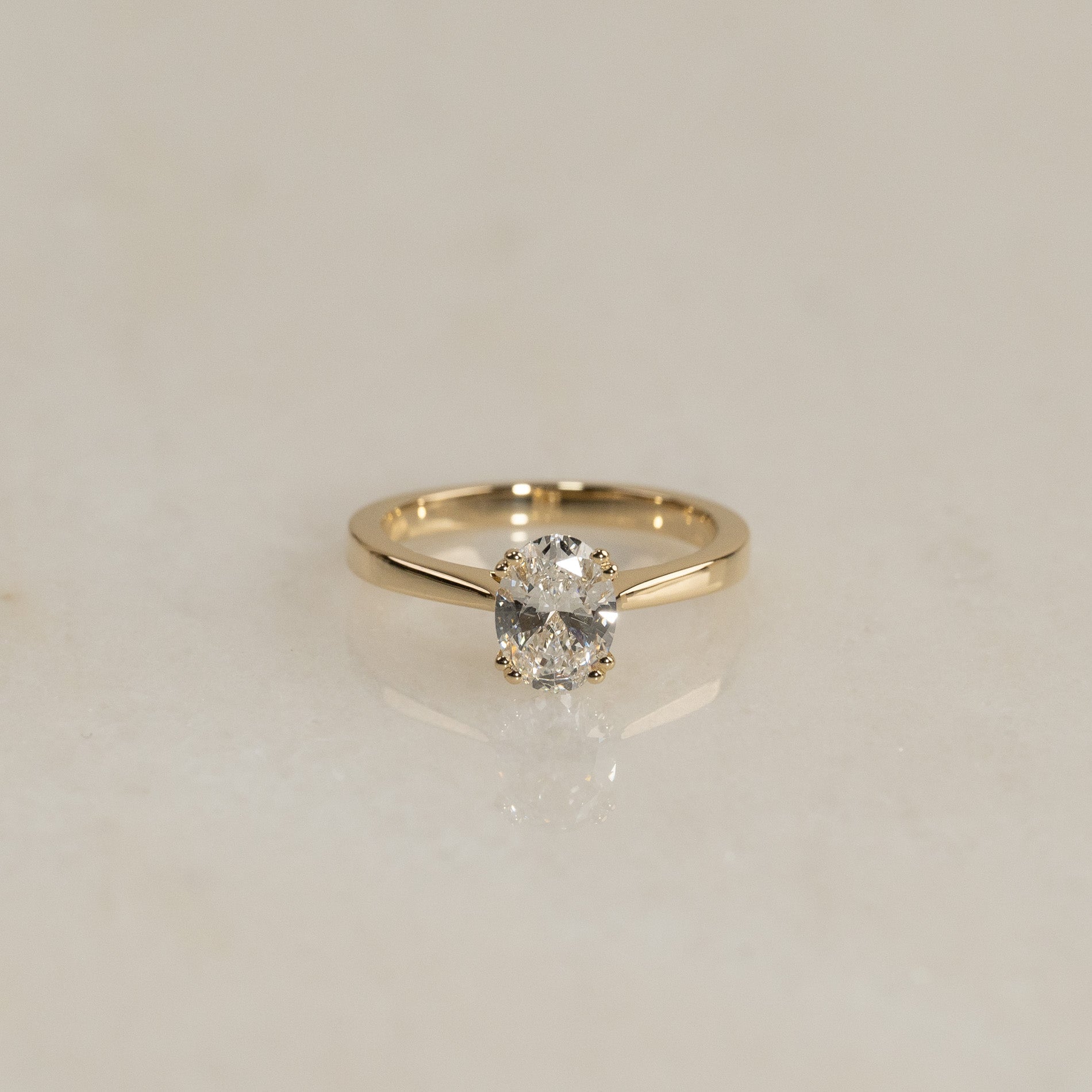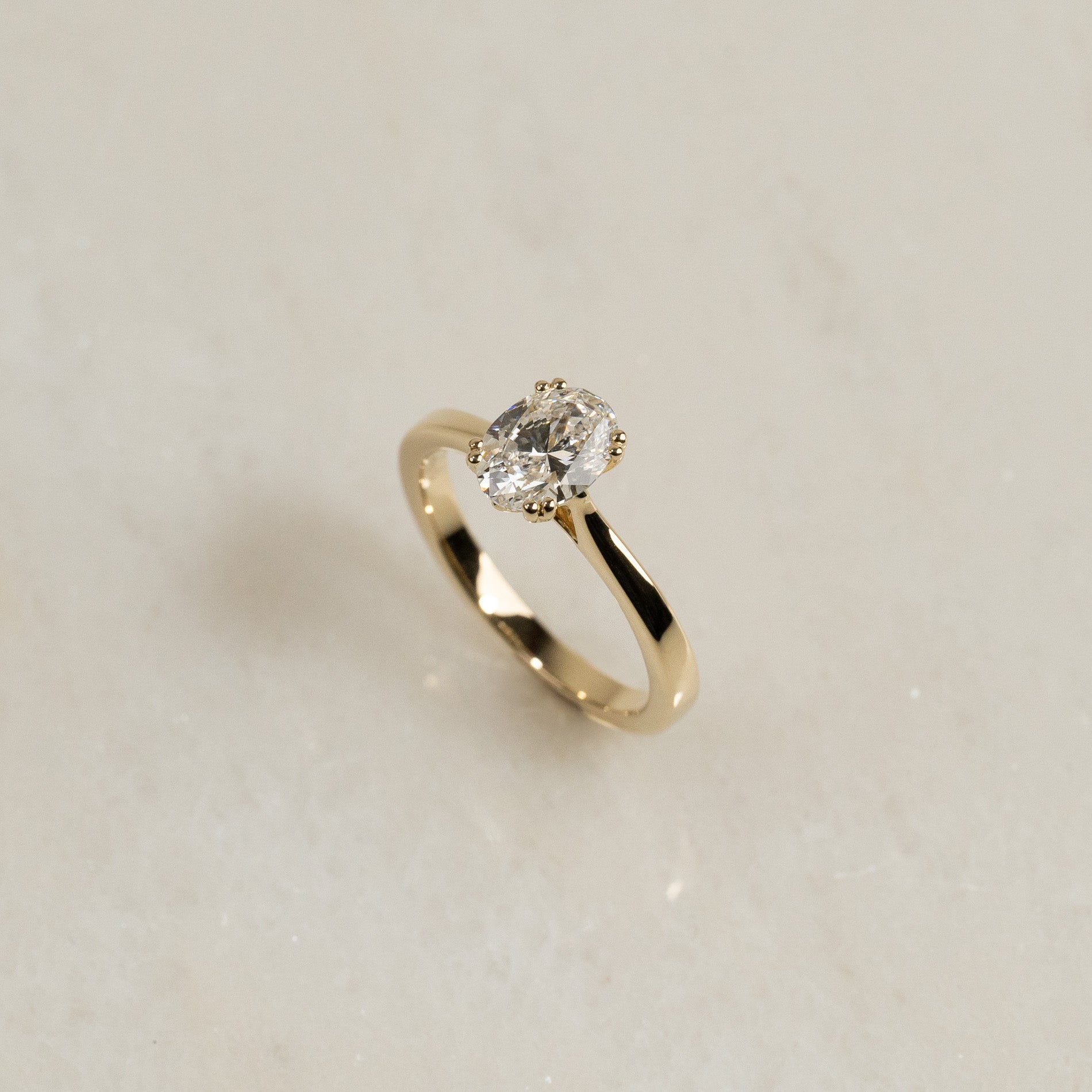 Ring i 14 karat massivt gull med en 1,0 ct. oval slipt labgrown diamant. Steinen er vakkert innfattet i en tulipaninnfatning som komplimenterer den elegante steinen. Som en ekstra detalj er tappene dobbelt avsluttede. Ringen er en perfekt cocktailring, den perfekte gaven til en du er glad i eller som den perfekte forlovelsesringen.