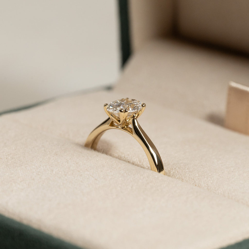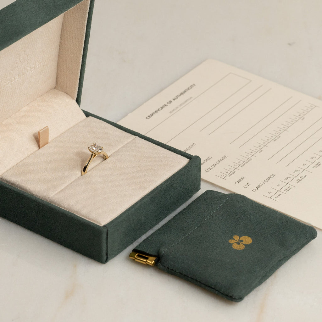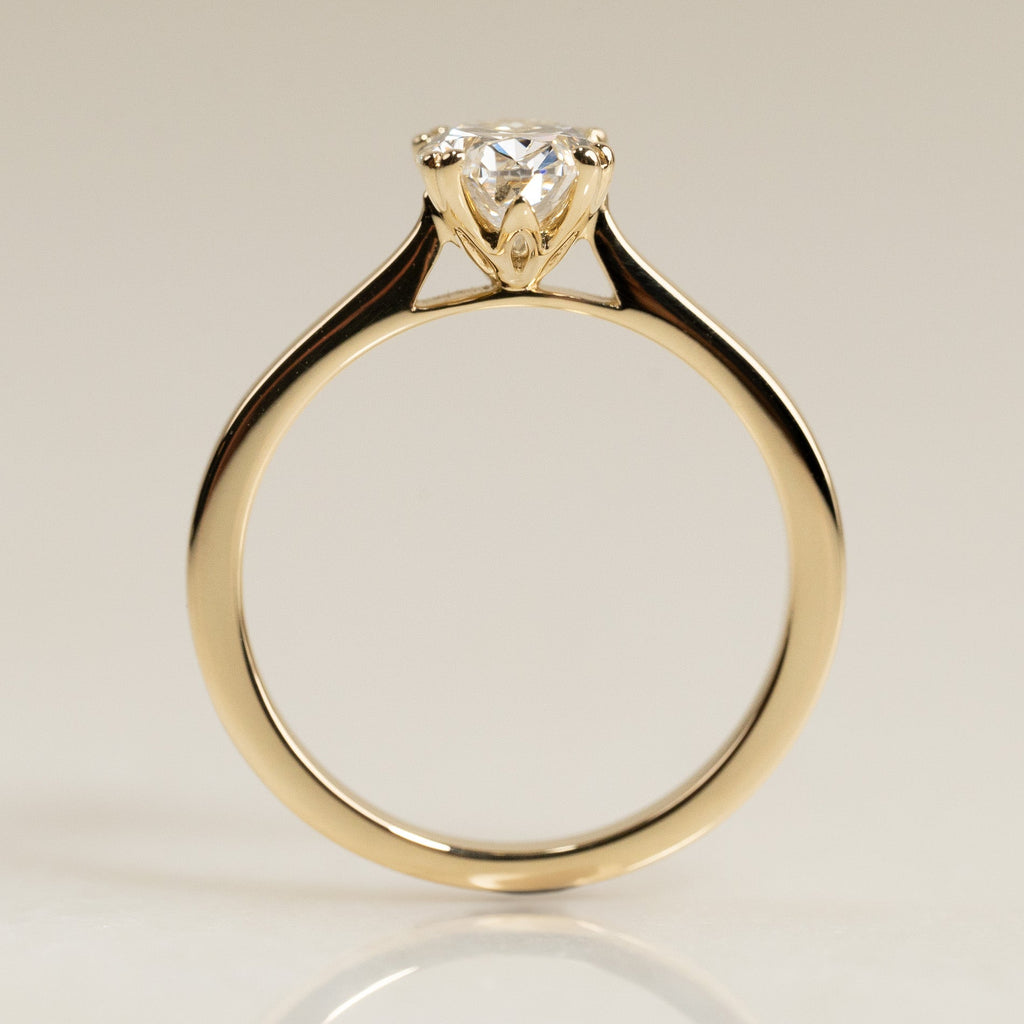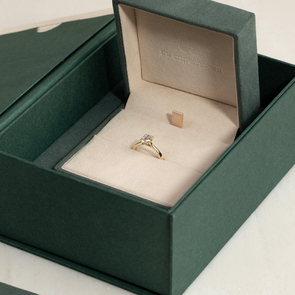 Ringen er laget i 14 karat massivt gull med en, laboratoriedyrket diamant på 1,0 ct. i farge E-F (River) og klarhet VVS. Smykket er laget med omtanke; diamantene er laget med solenergi, og gullet er 100 % sertifisert resirkulert.