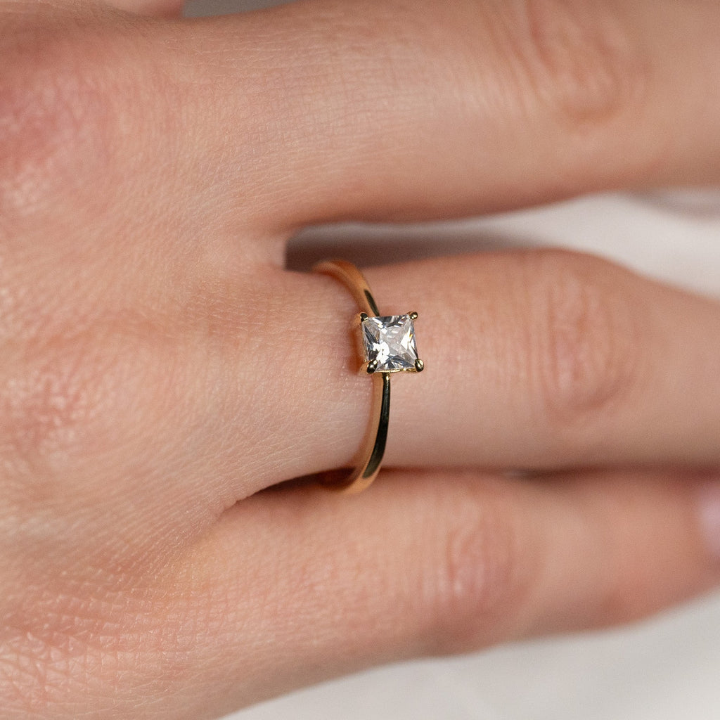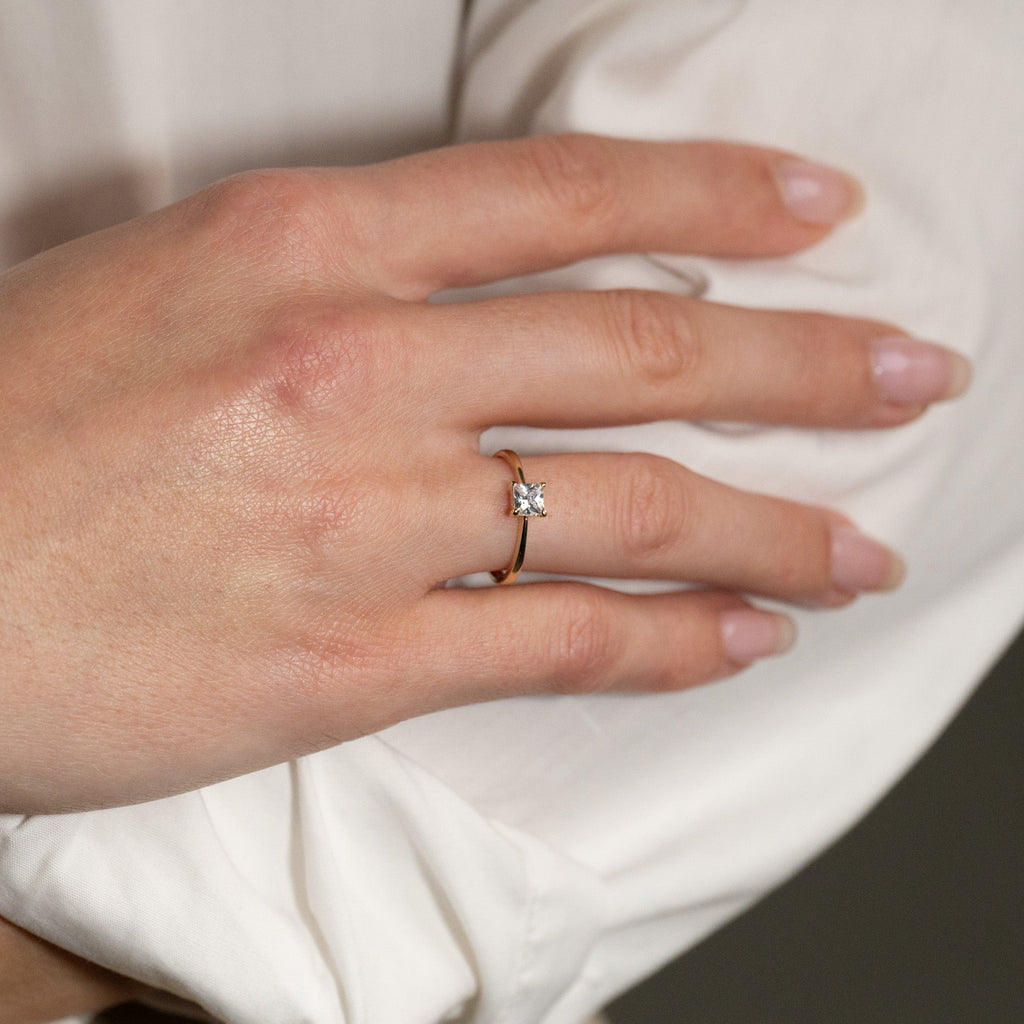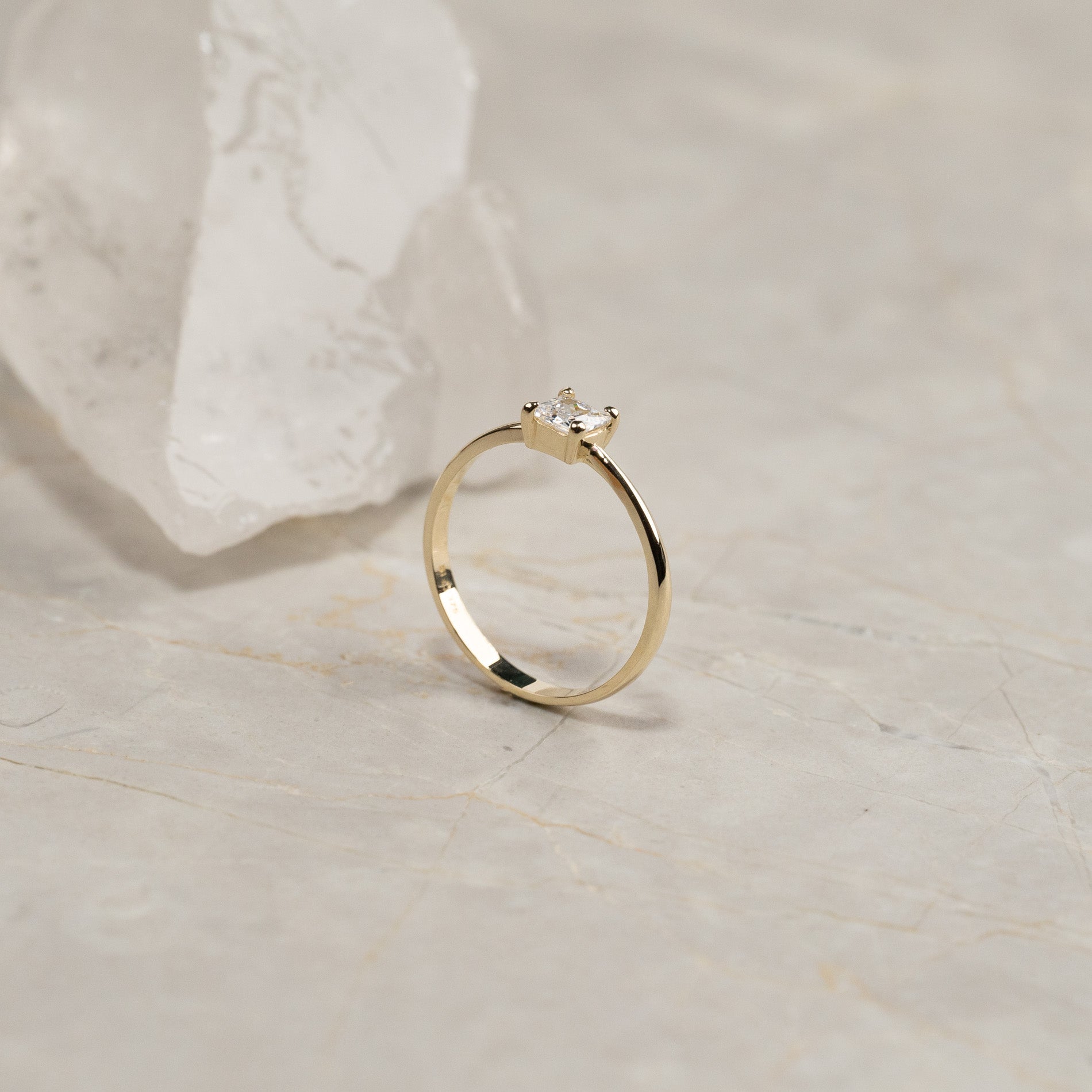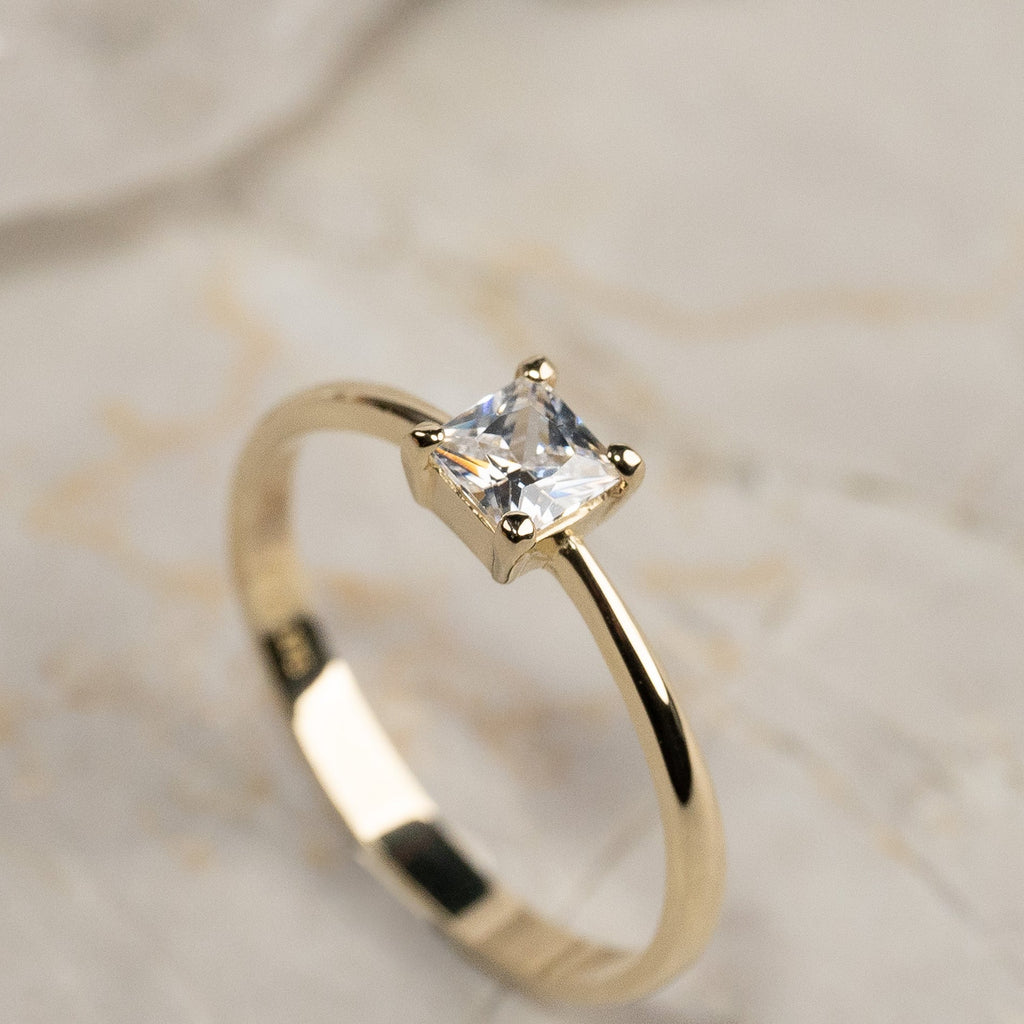 Ring laget av 100 % resirkulert 9 karat massivt gull med en klar firkantslipt kubisk zirkonia.
