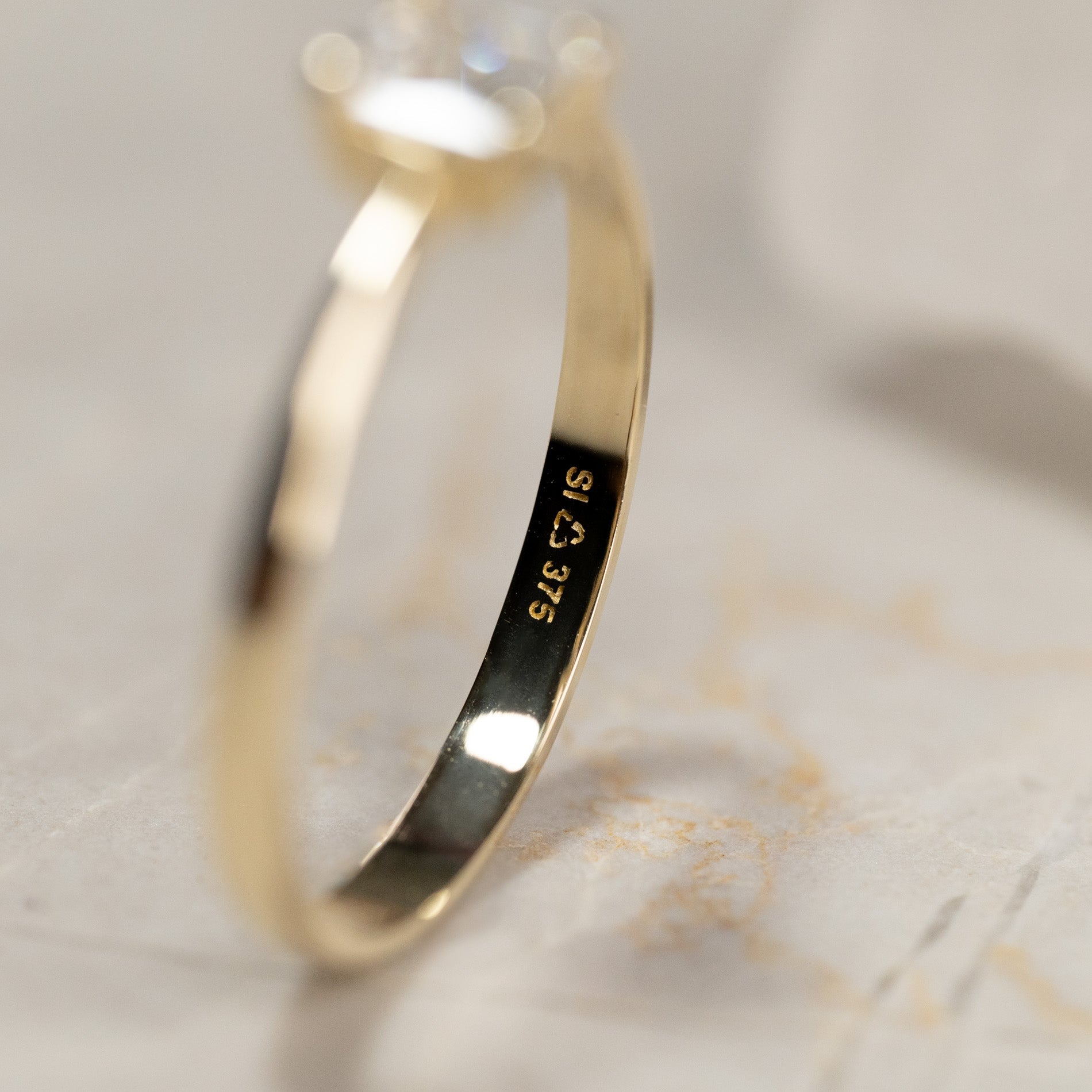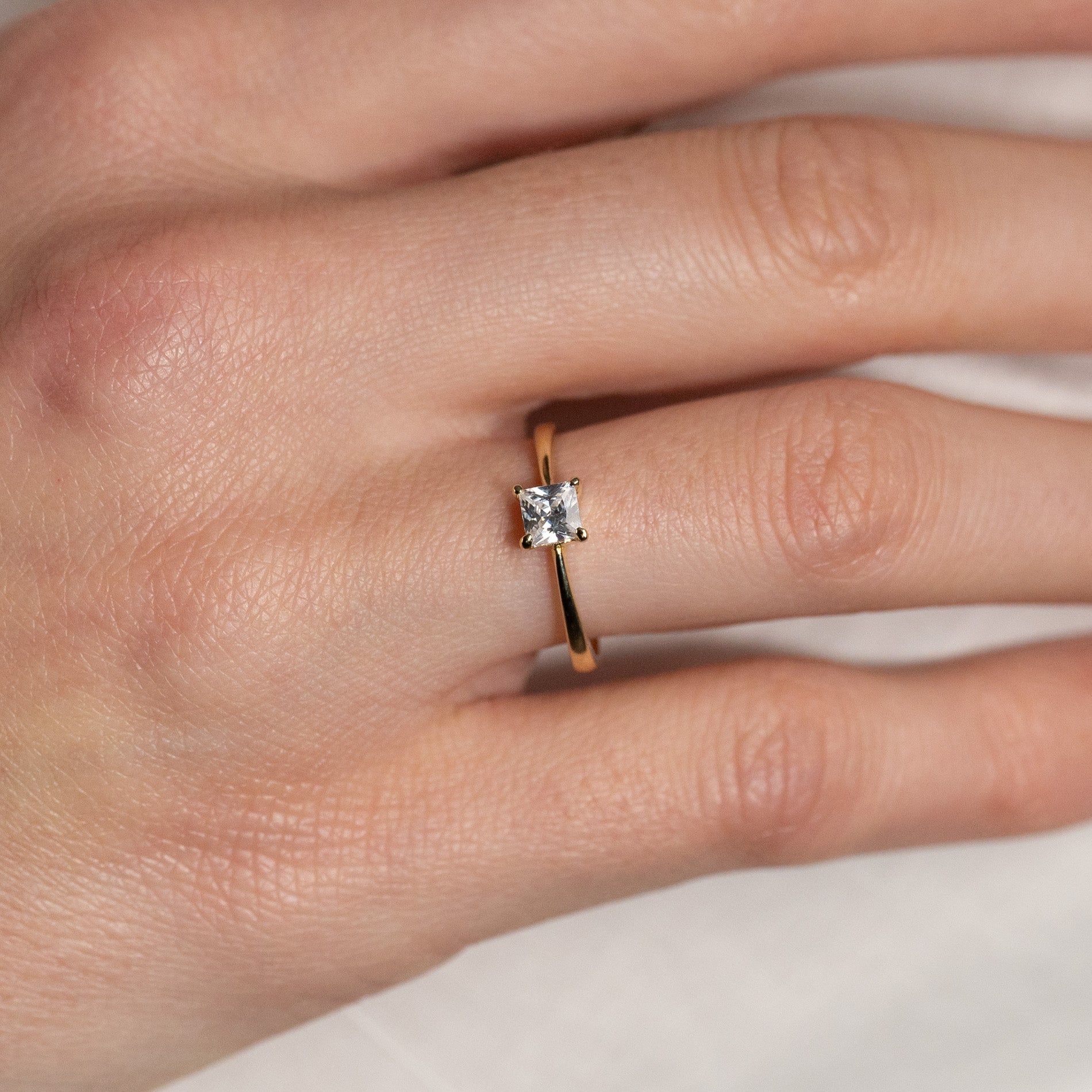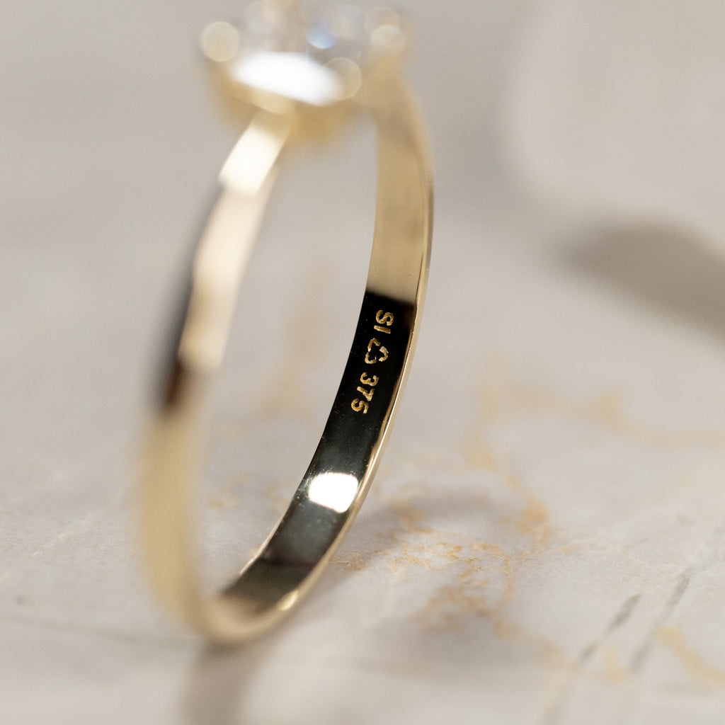 Ring laget av 100 % resirkulert 9 karat massivt gull med en klar firkantslipt kubisk zirkonia.