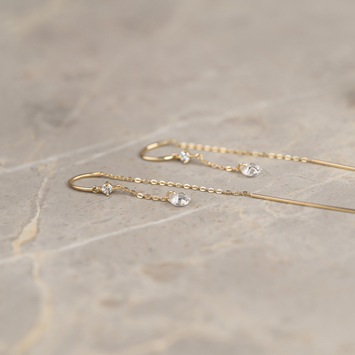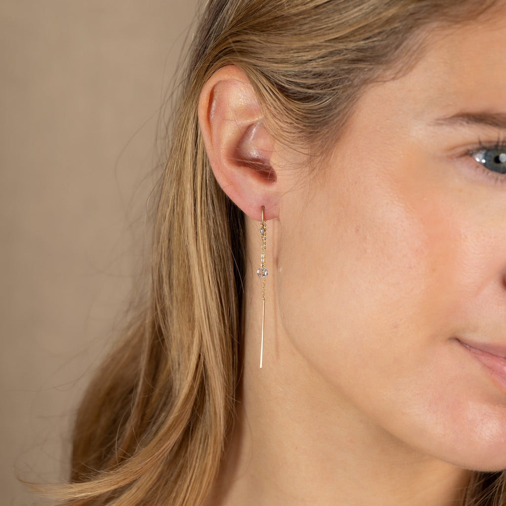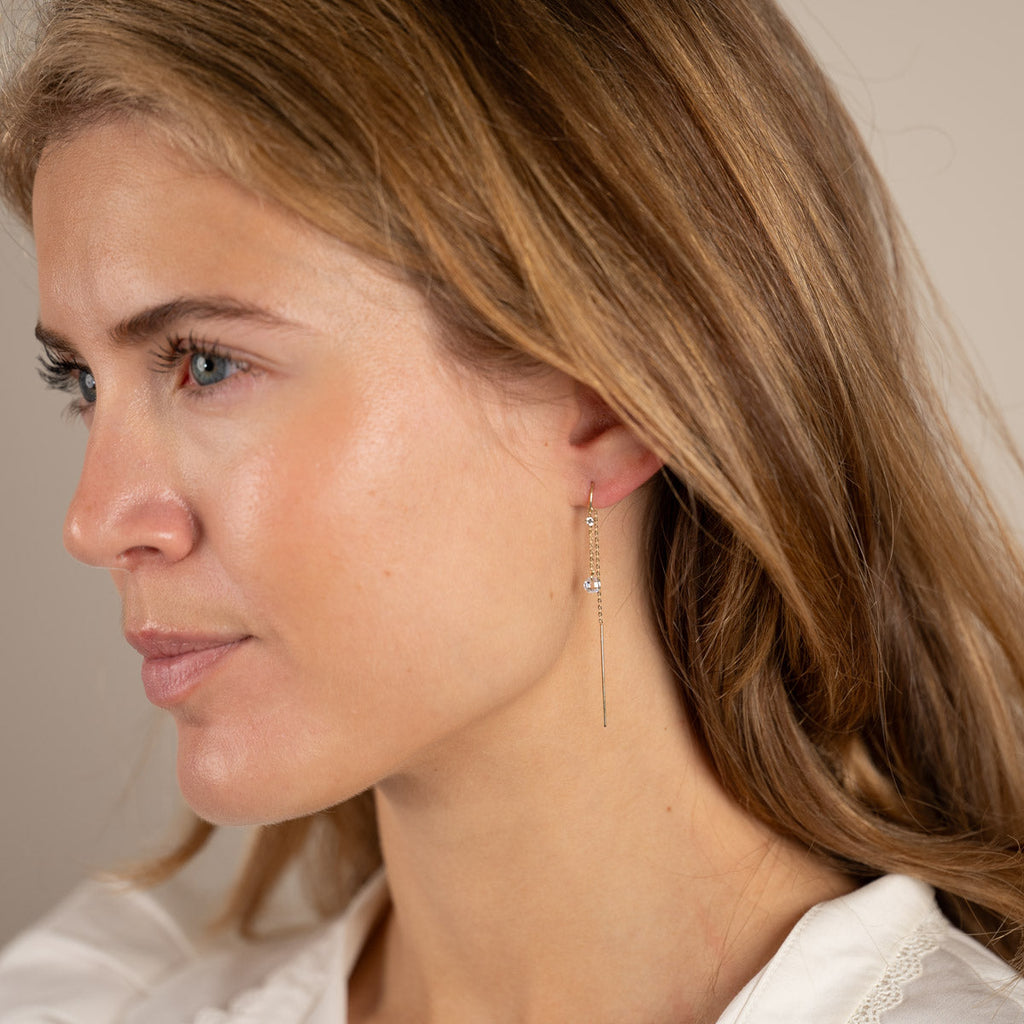 Øreringene er designet med en bøjle med et vakkert kjede som trekkes gjennom øret. Hver ørering har to hvite zirkoniastener i ulike størrelser. Øreringene har et elegant og feminint touch.