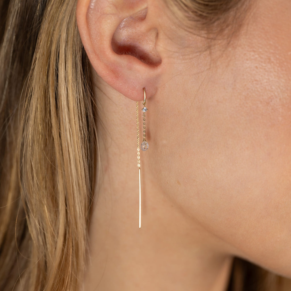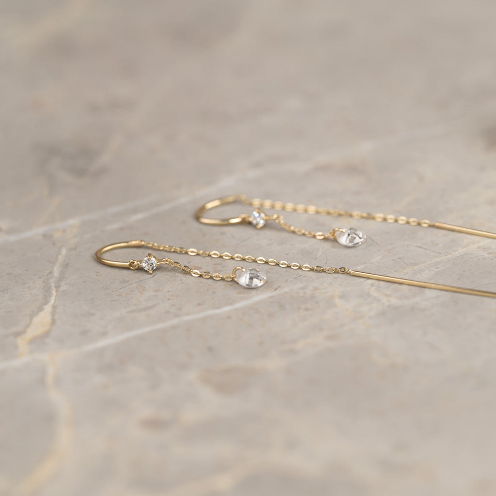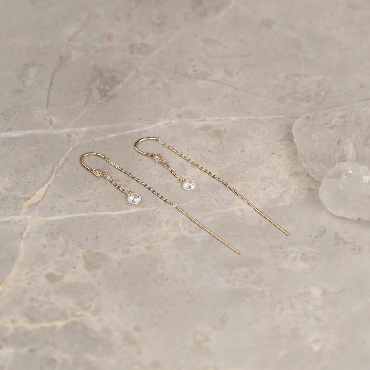 Øreringene er designet med en bøjle med et vakkert kjede som trekkes gjennom øret. Hver ørering har to hvite zirkoniastener i ulike størrelser. Øreringene har et elegant og feminint touch.