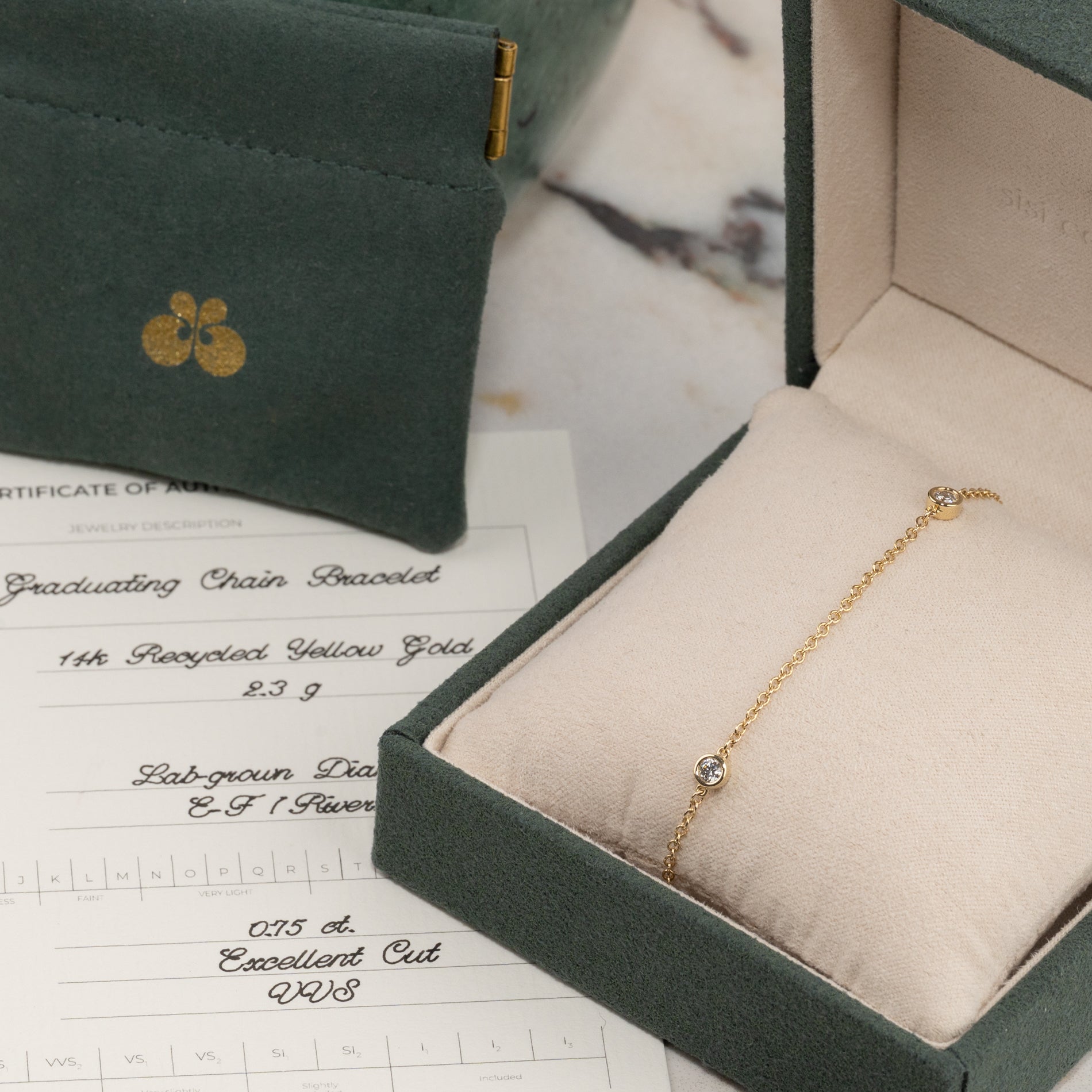 Armbåndet er laget i 14 karat massivt gull og prydet med lab-grown diamanter med en total vekt på 0,3 ct. Diamantene har fargen E/F (River) og klarheten VVS. Smykket er skapt med omtanke – diamantene er fremstilt med blant annet solenergi, og gullet er 100 % sertifisert resirkulert.