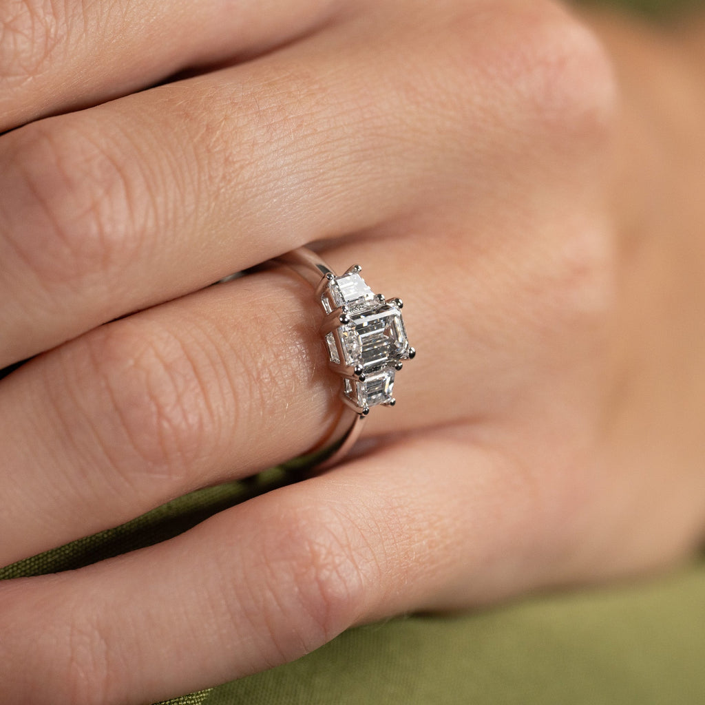 Tre-stensring i 14 karat hvitt gull med laboratoriedyrkede diamanter på totalt 1,5 ct. Midtstenen er en 1 ct. smaragdslipt laboratoriedyrkede diamante, flankert av to trapèsformede sidestener.