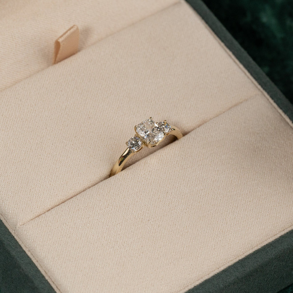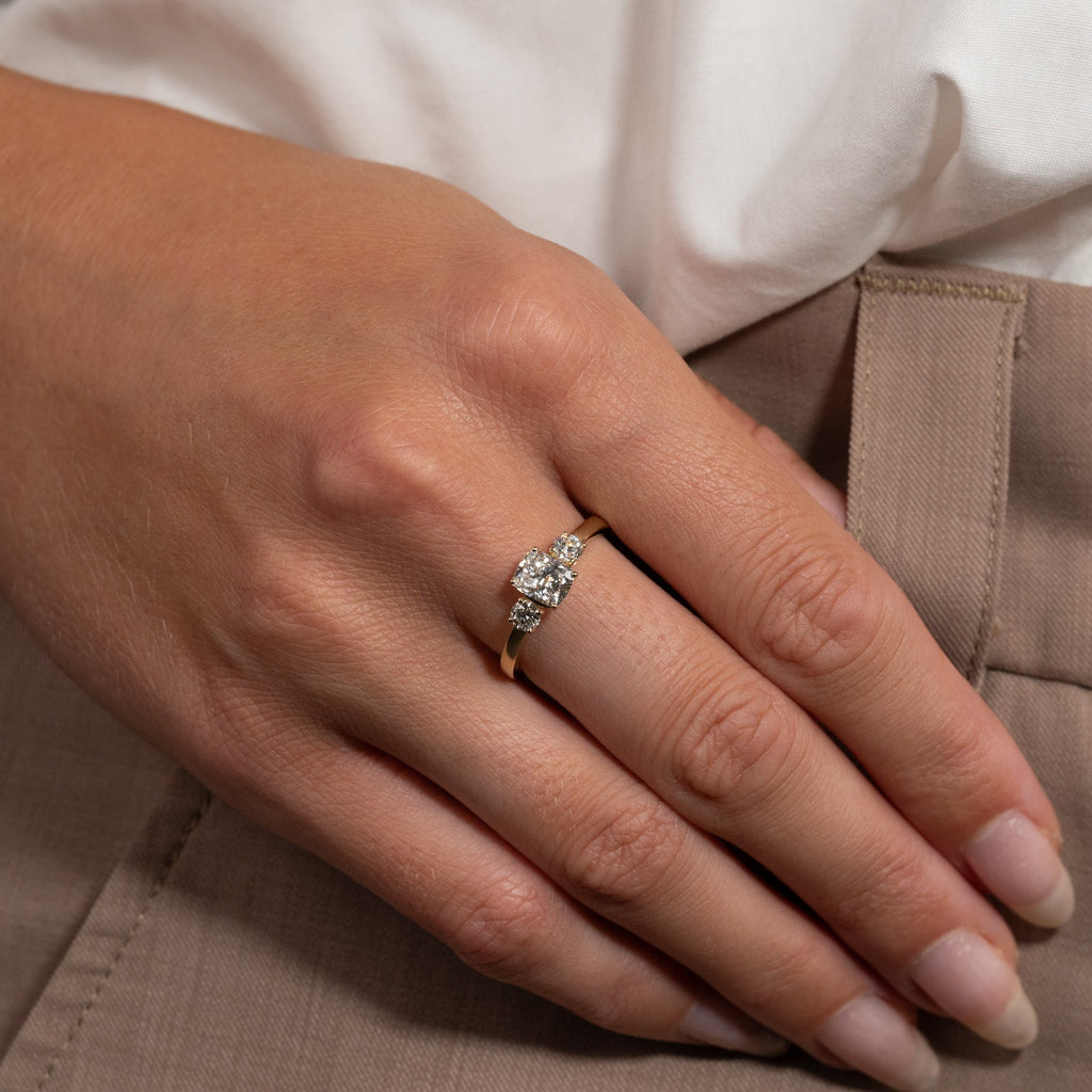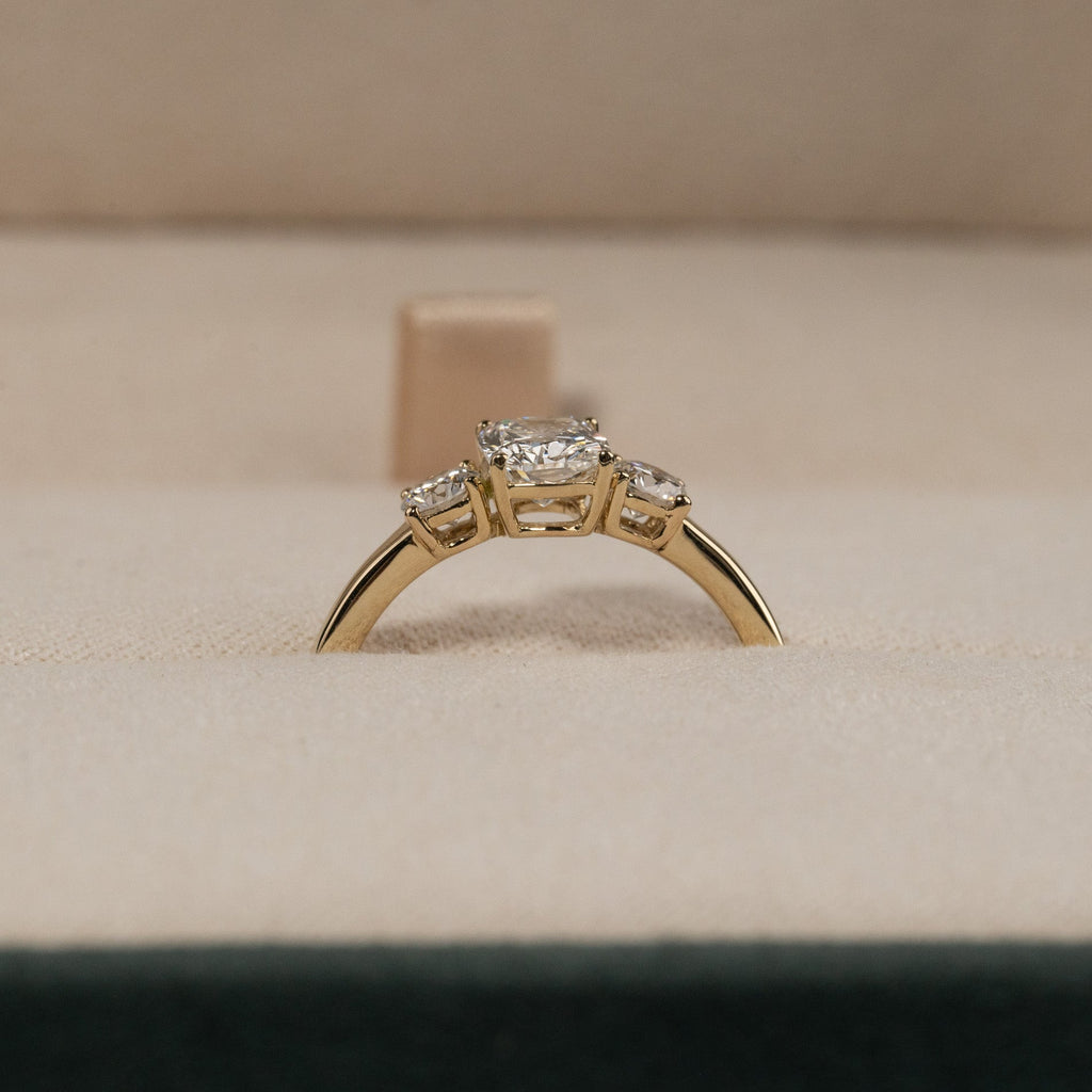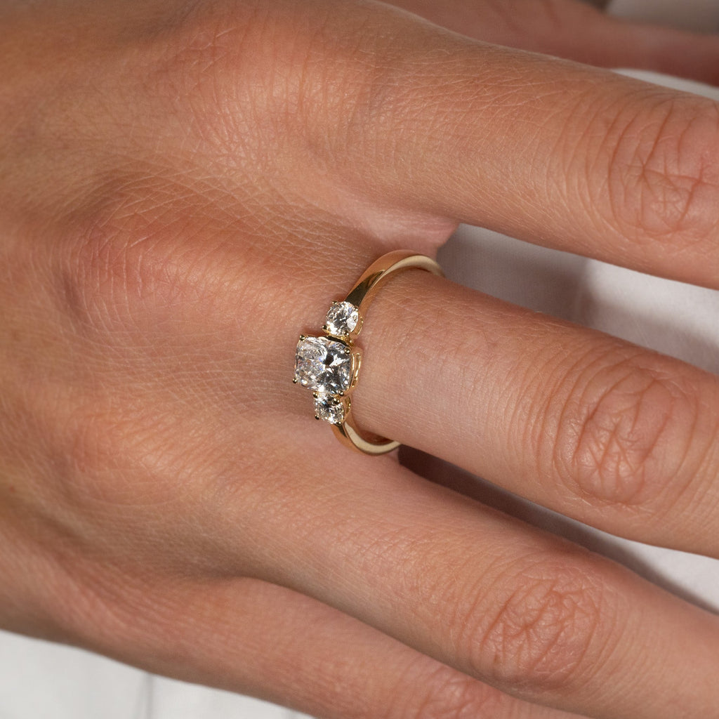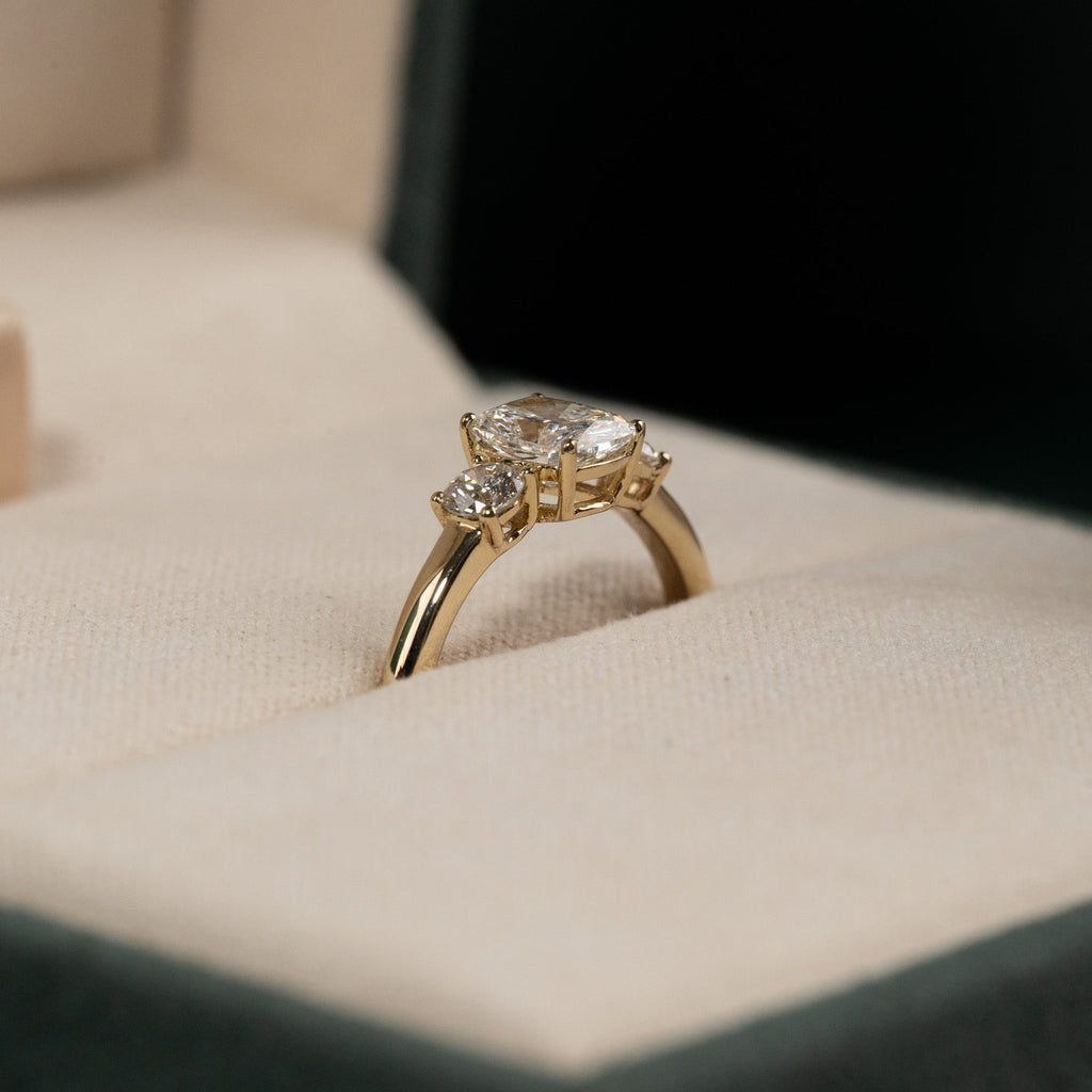 Ring i 14 karat massivt gull med tre laboratoriedyrkede diamanter. Senterstenen er en avlang puteslipt lab-dyrket diamant på 0,8 ct., flankert av to briljanter på totalt 0,35 ct. Omfatningen er utformet som en allianseomfatning. Ringen er et klassisk og tidløst smykke, som også kan brukes som forlovelsesring.