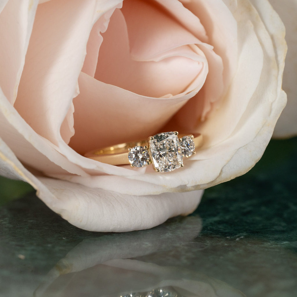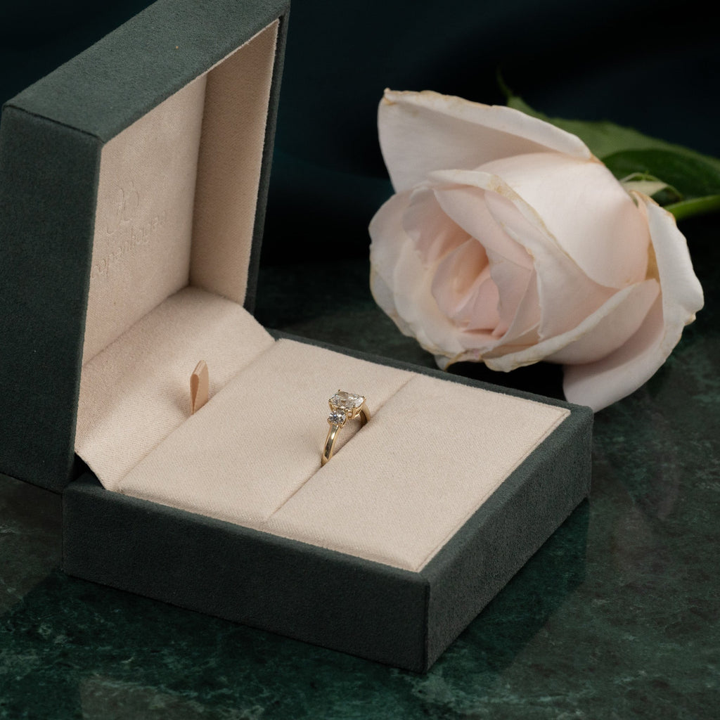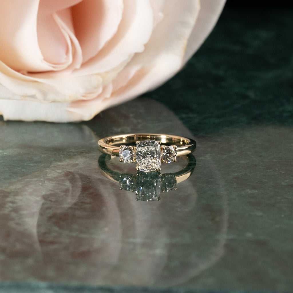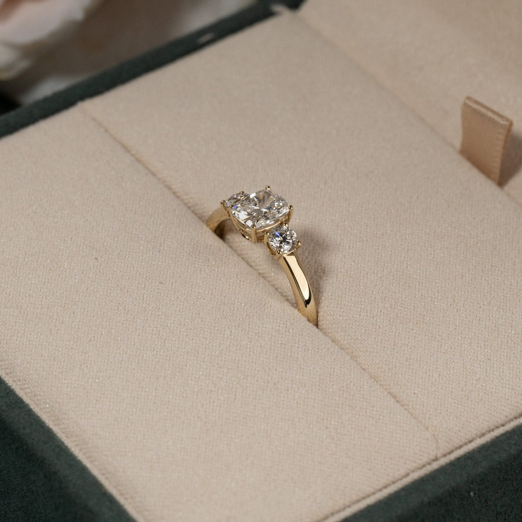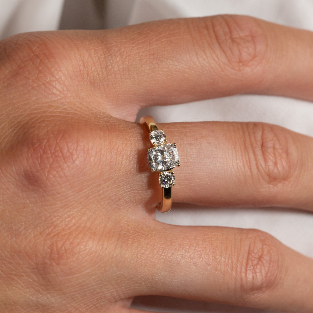 Ring i 14 karat massivt gull med tre laboratoriedyrkede diamanter. Senterstenen er en avlang puteslipt lab-dyrket diamant på 0,8 ct., flankert av to briljanter på totalt 0,35 ct. Omfatningen er utformet som en allianseomfatning. Ringen er et klassisk og tidløst smykke, som også kan brukes som forlovelsesring.