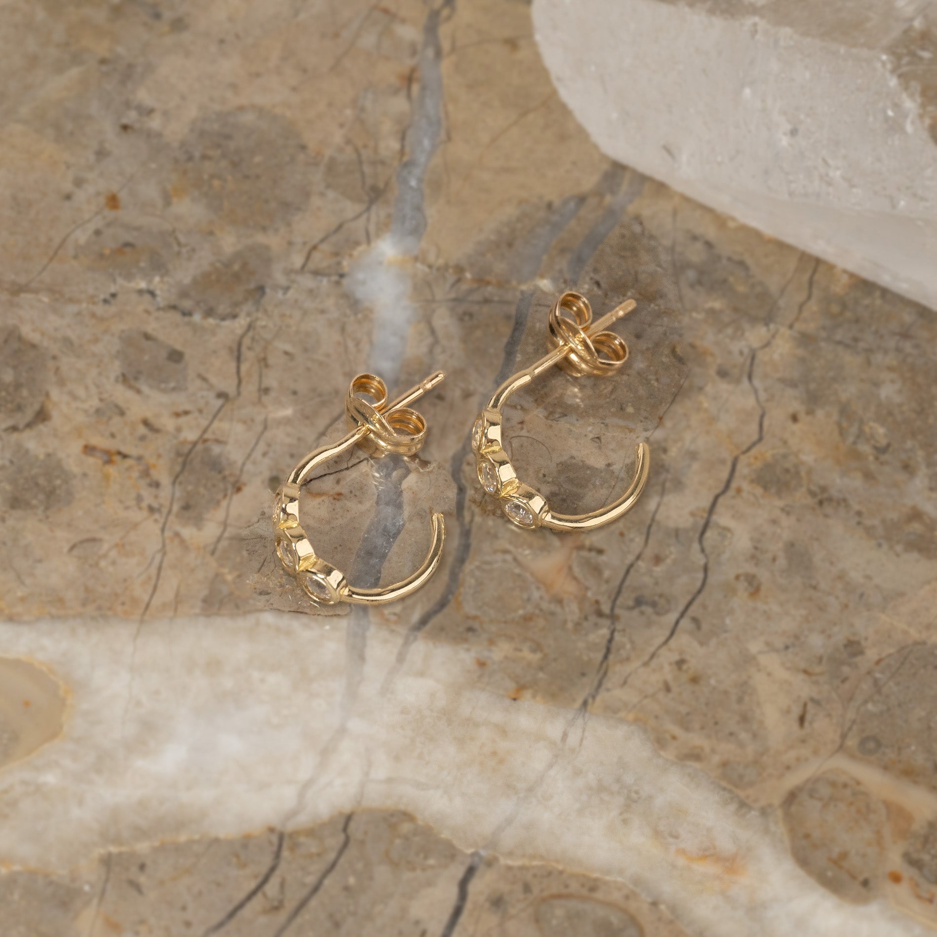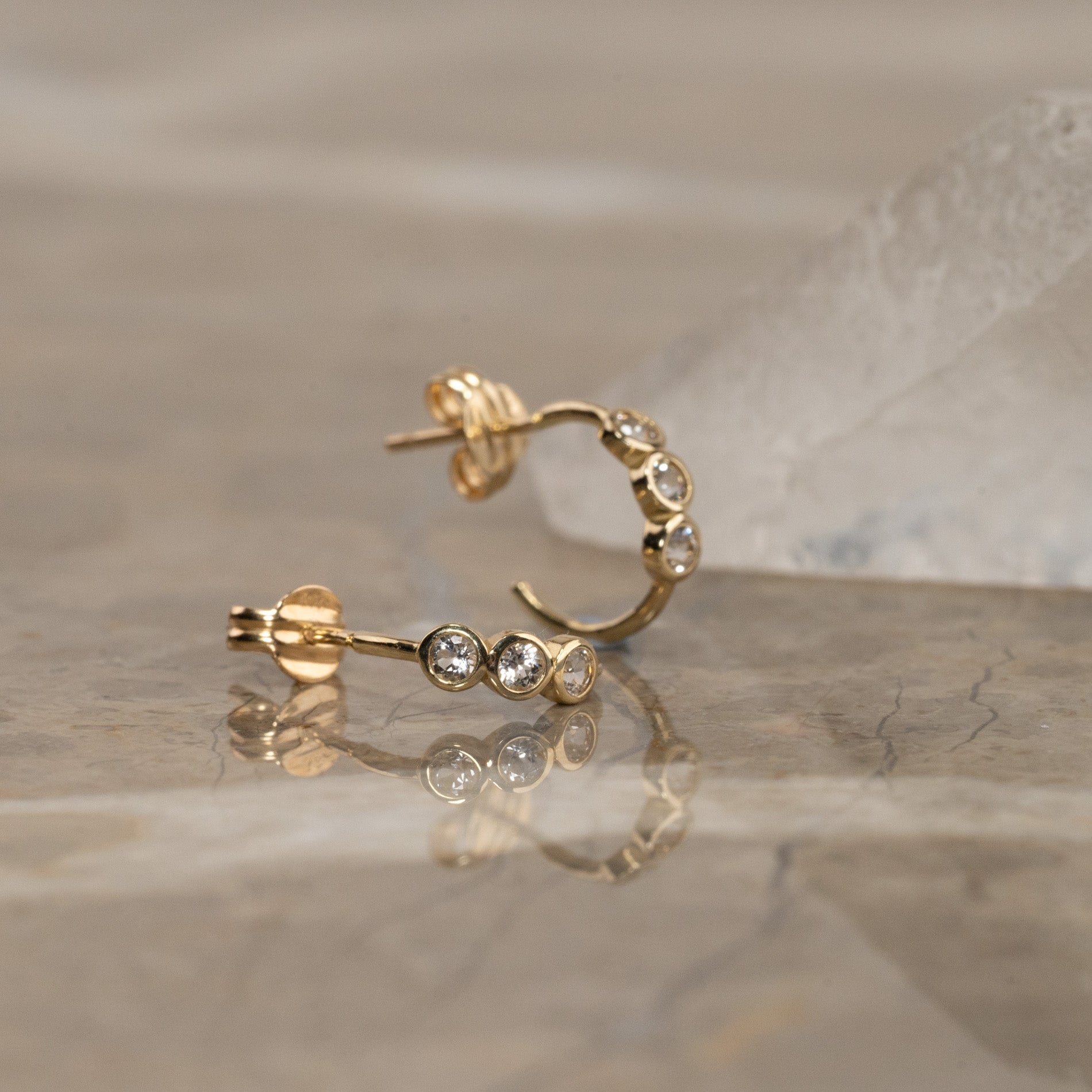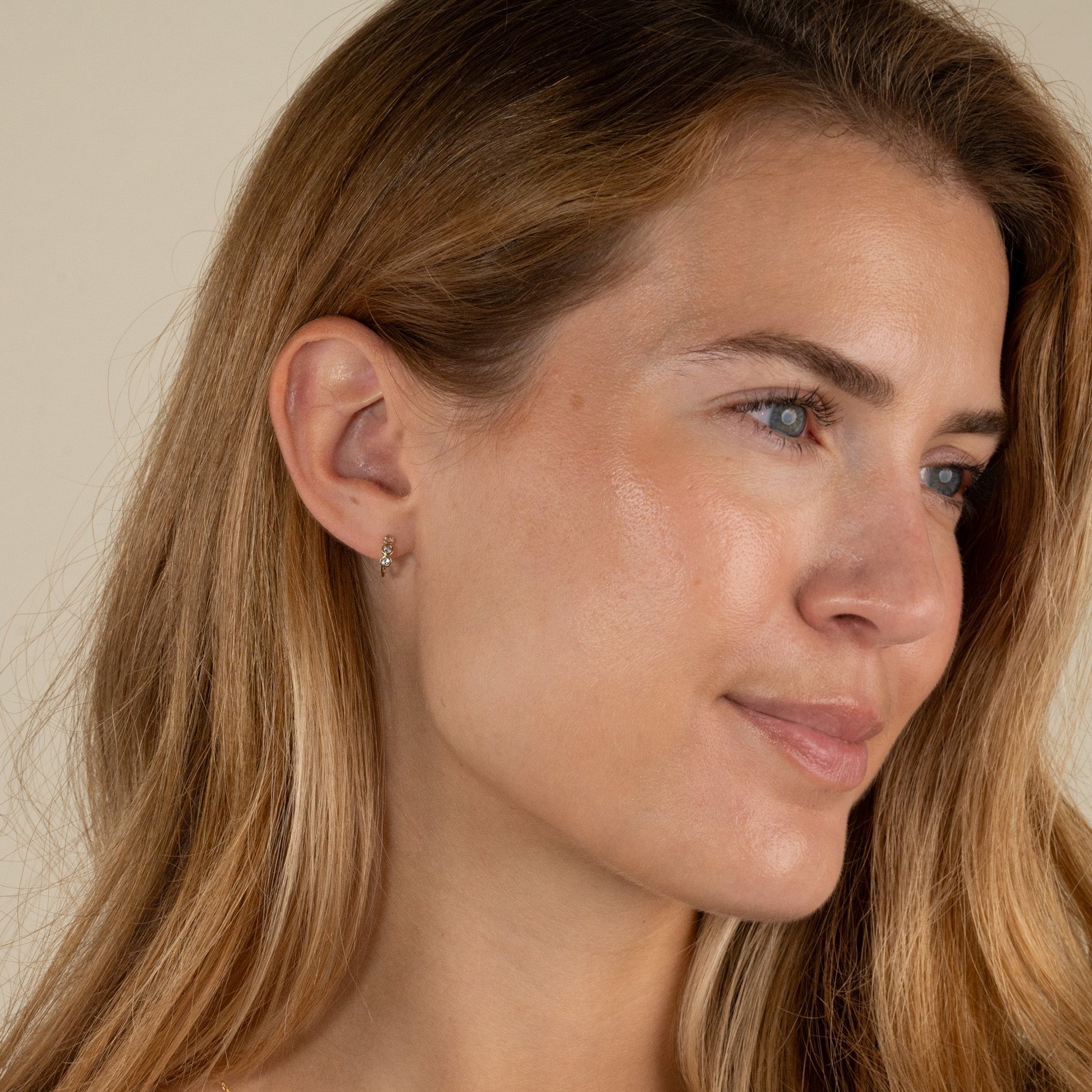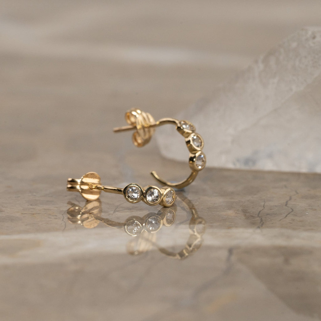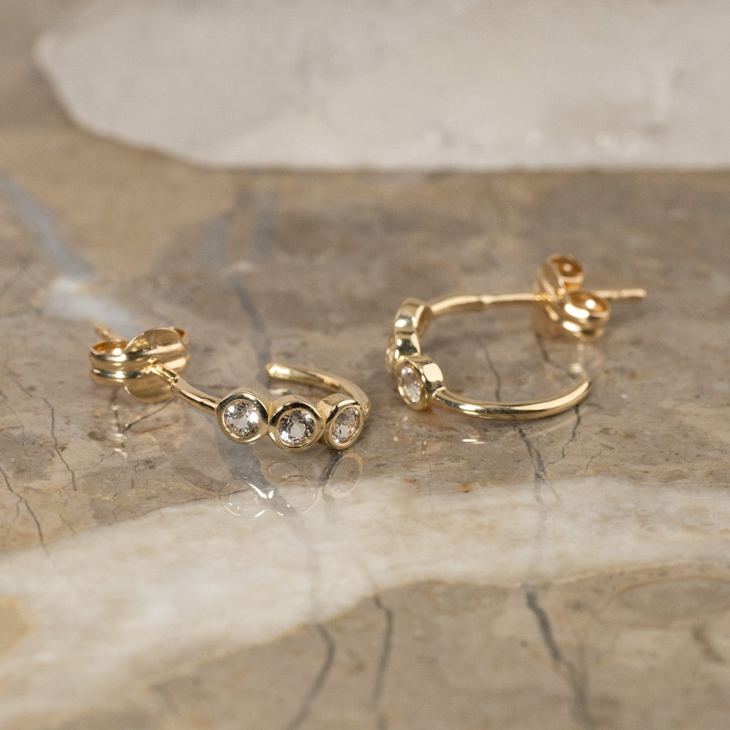 Vakre øredobber i 100% resirkulert massivt 9 karat gull. Øredobbene består av tre hvite topaser, som gir øredobben unike detaljer og et feminint utseende.