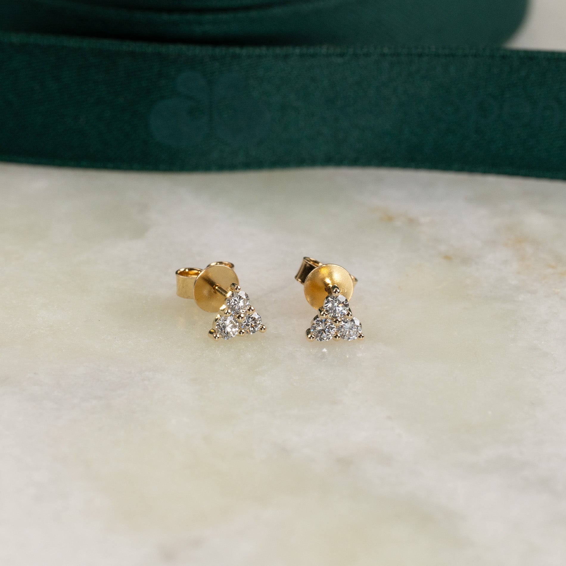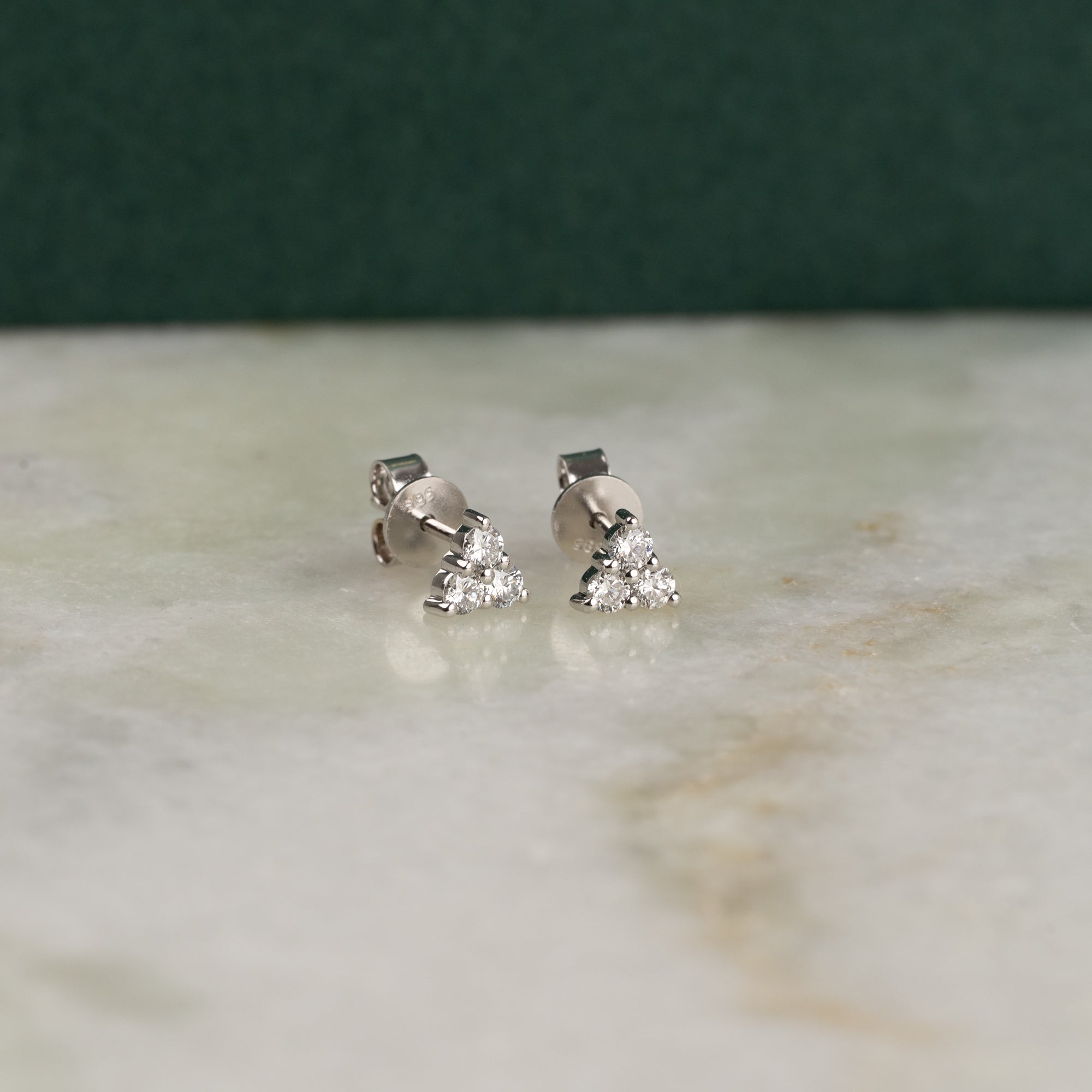 Diamantøredobber med tre briljanslipte lab-grown diamanter satt sammen i en trekant.