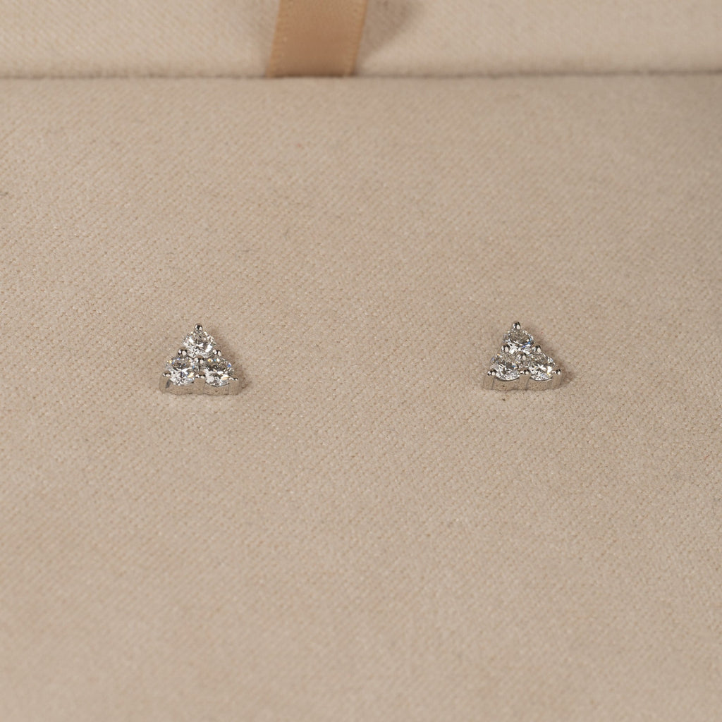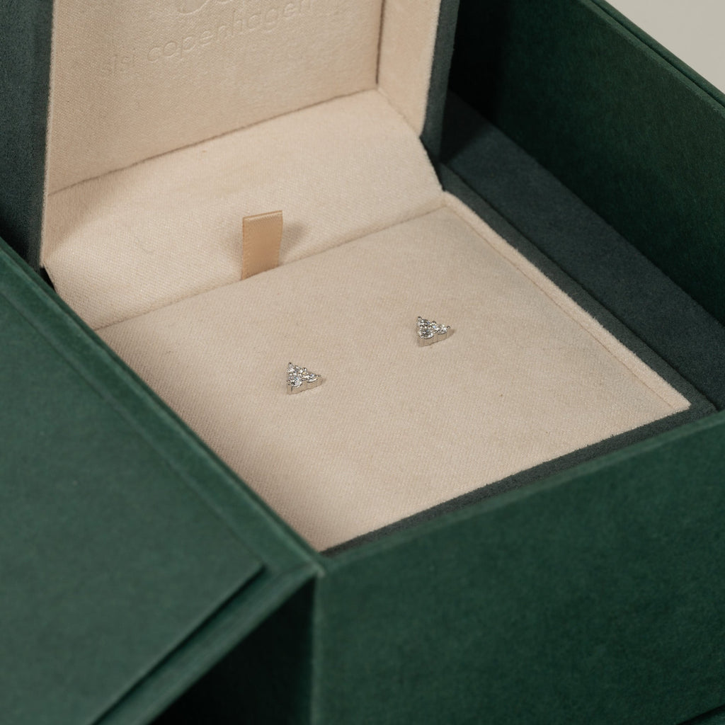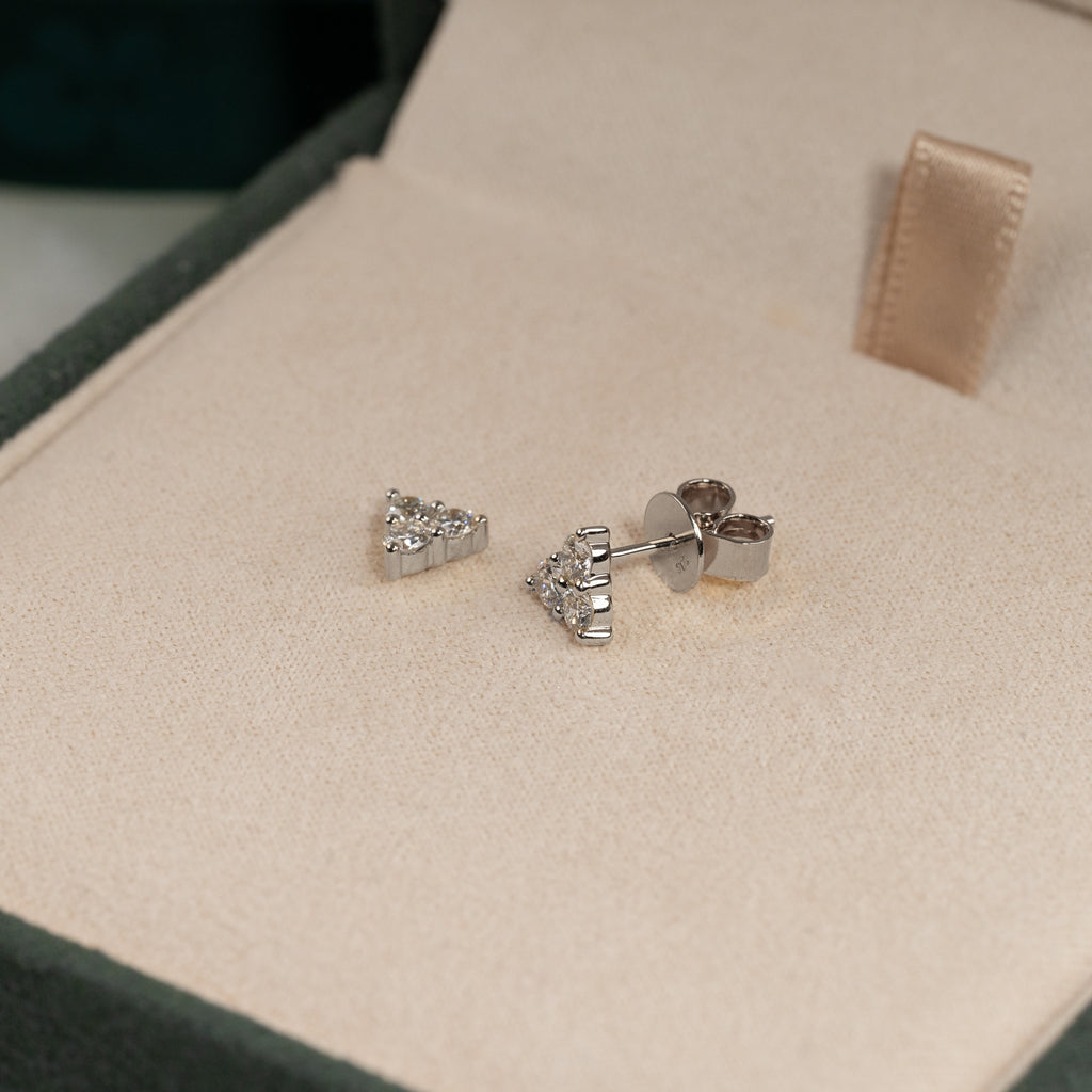 Diamantøredobber med tre briljanslipte lab-grown diamanter satt sammen i en trekant. Øredobbene er enkle, elegante og passer perfekt både til hverdag og festlige begivenheter.