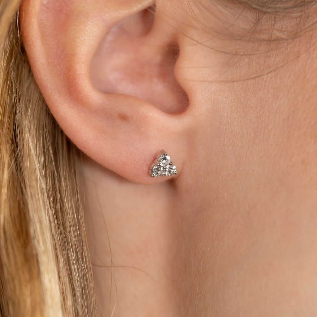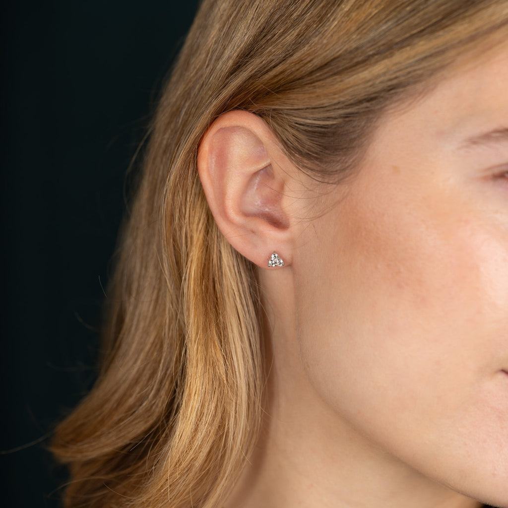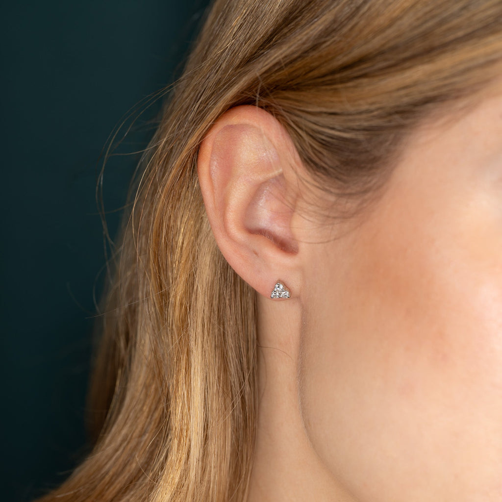 Diamantøredobber med tre briljanslipte lab-grown diamanter satt sammen i en trekant. Øredobbene er enkle, elegante og passer perfekt både til hverdag og festlige begivenheter.