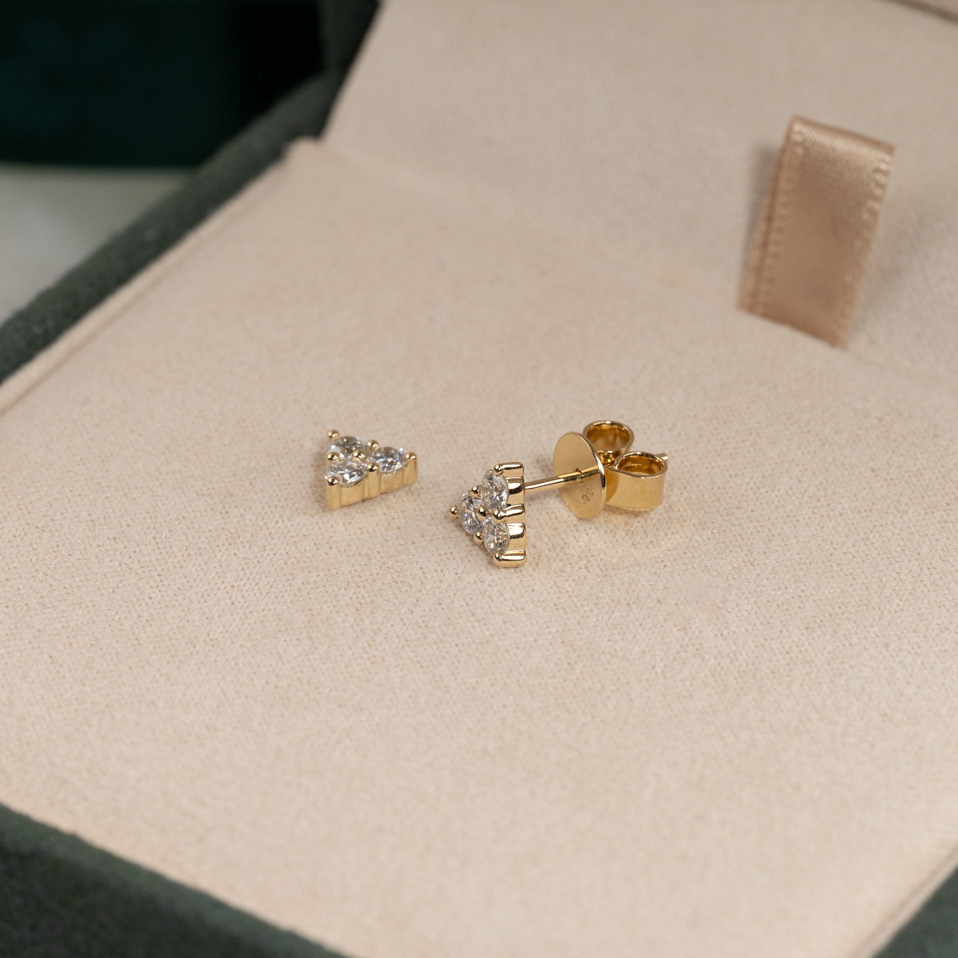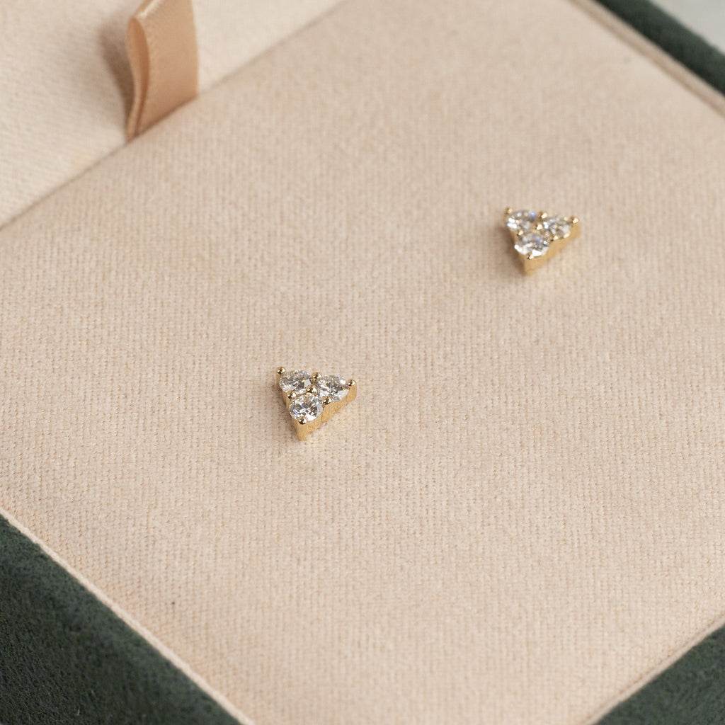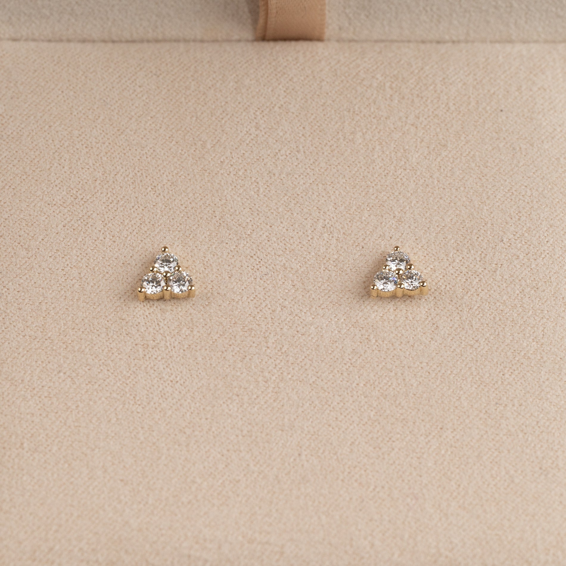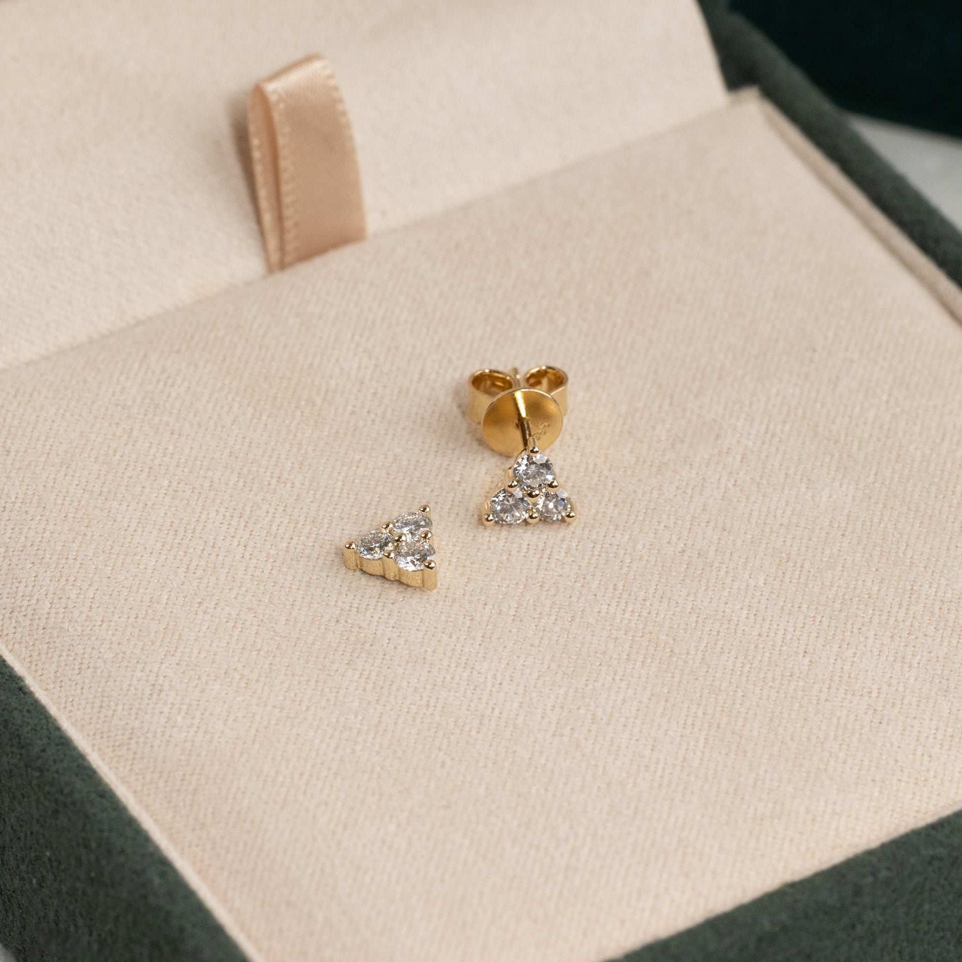 Diamantøredobber med tre briljanslipte lab-grown diamanter satt sammen i en trekant. Øredobbene er enkle, elegante og passer perfekt både til hverdag og festlige begivenheter.