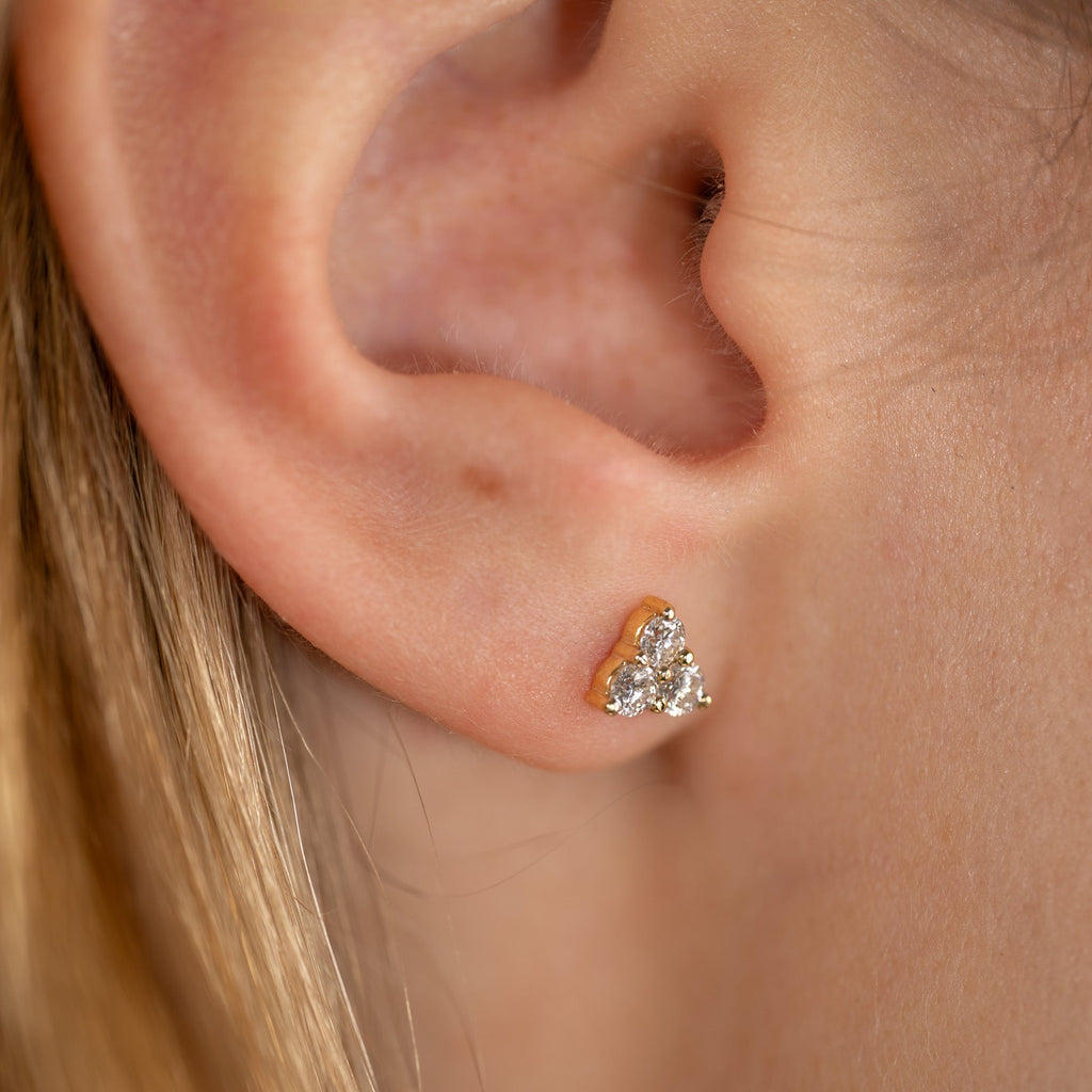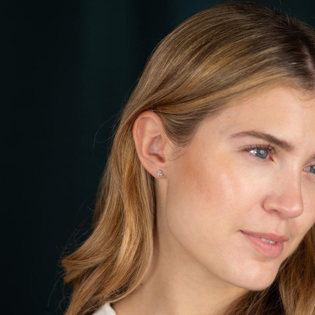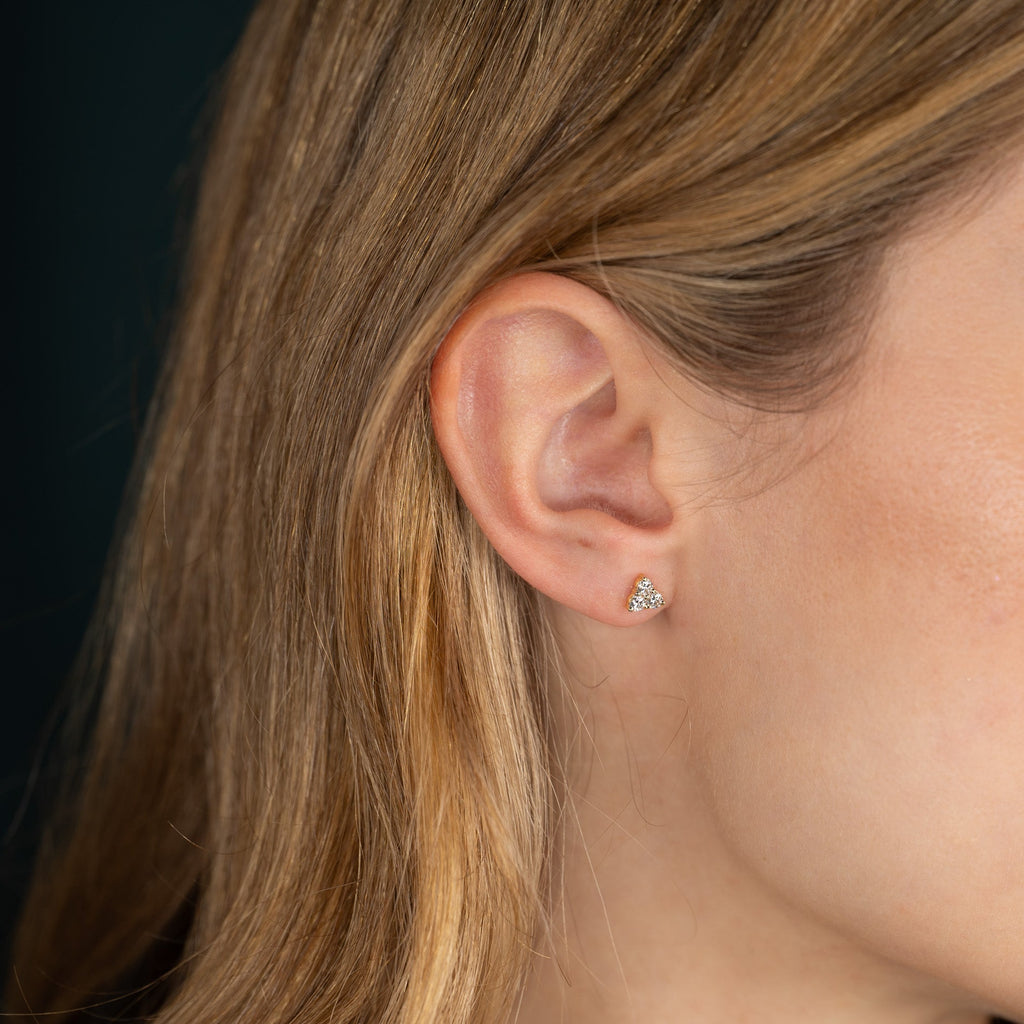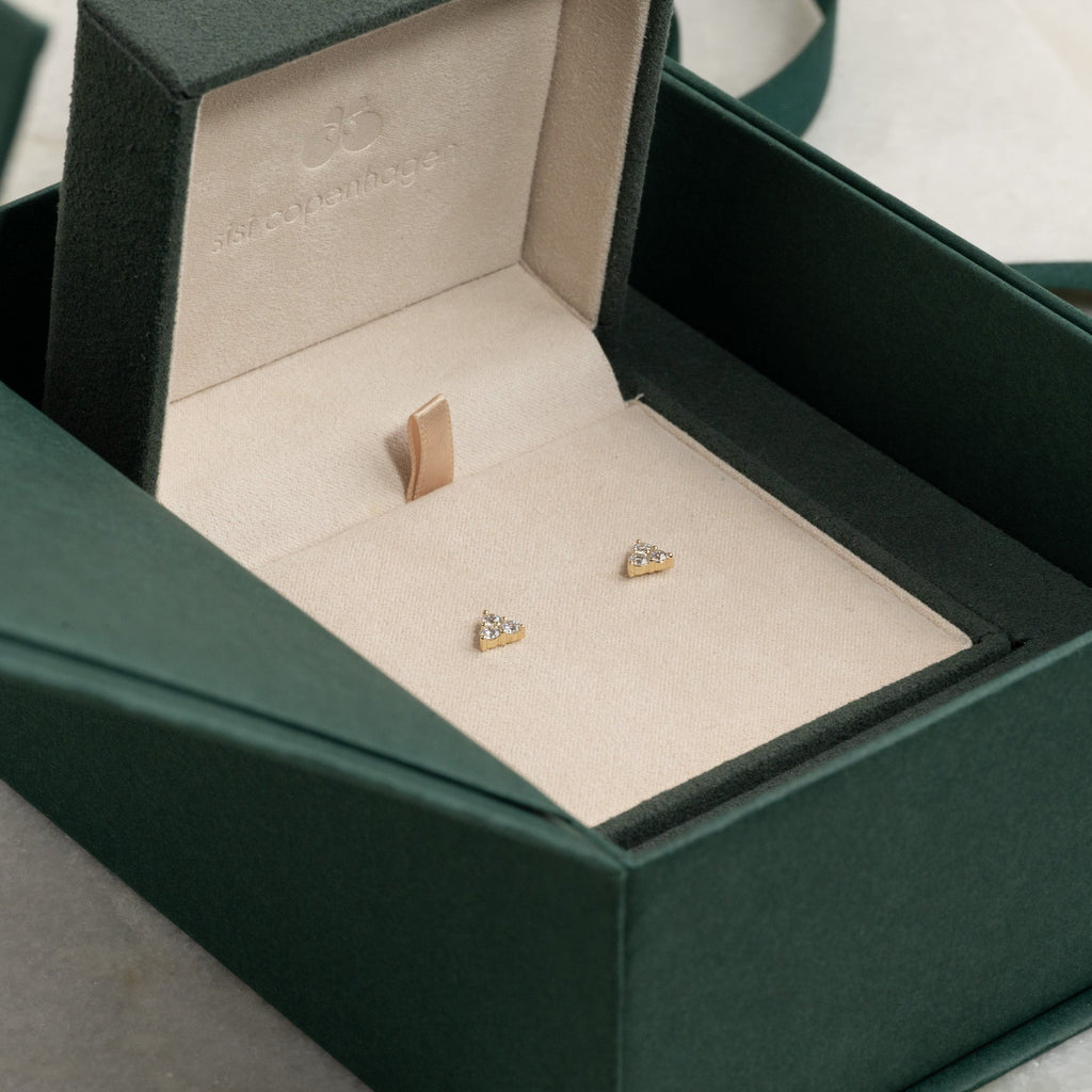 Diamantøredobber med tre briljanslipte lab-grown diamanter satt sammen i en trekant. Øredobbene er enkle, elegante og passer perfekt både til hverdag og festlige begivenheter.
