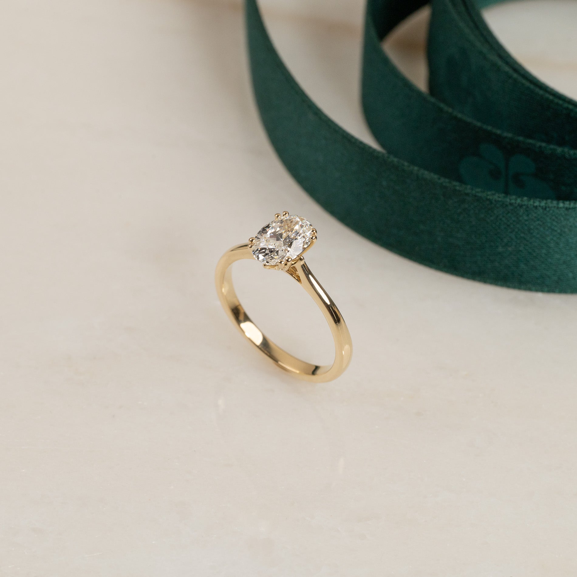Ring i 14 karat massivt gull med en oval slipt labgrown diamant. Steinen er vakkert innfattet i en tulipaninnfatning som komplimenterer den elegante steinen. Som en ekstra detalj er tappene dobbelt avsluttede. Ringen er en perfekt cocktailring, den perfekte gaven til en du er glad i eller som den perfekte forlovelsesringen.