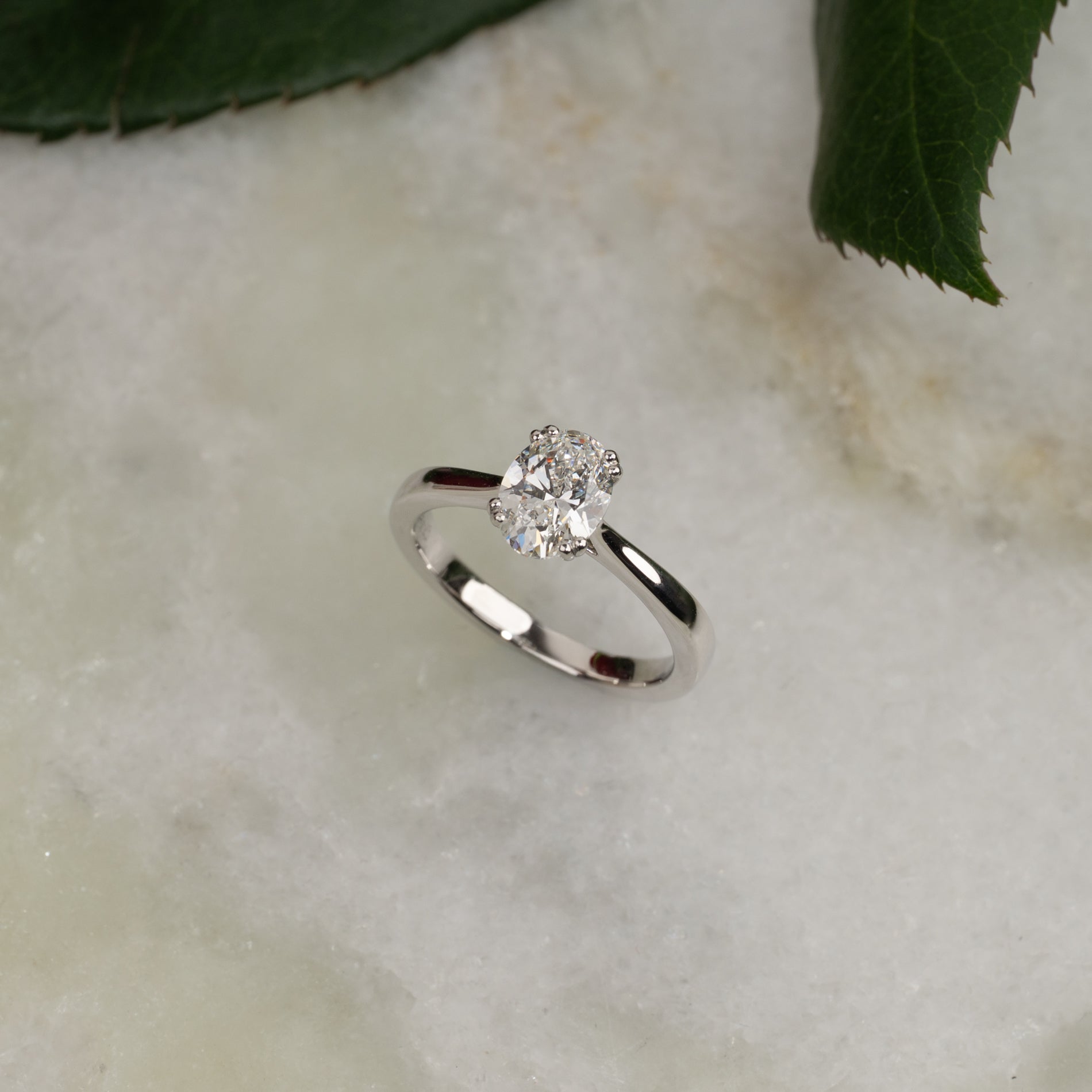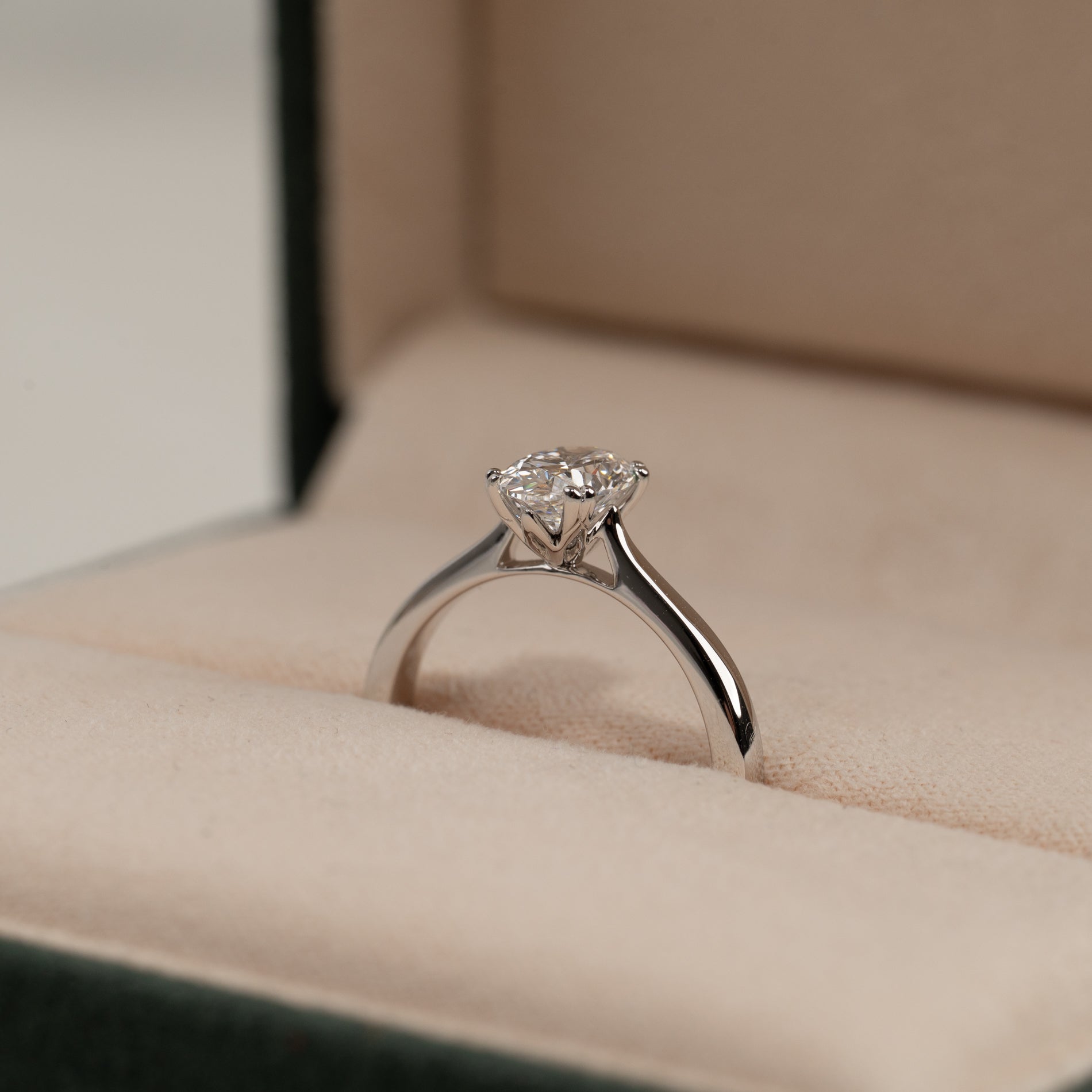 En elegant ring i 14 karat hvitt gull med en 1,0 ct ovalslipt laboratoriedyrket diamant. Diamanten er vakkert satt i en tulipan-innfatning, hvor de doble klørne tilfører en raffinert detalj og fremhever stenens silhuett.
