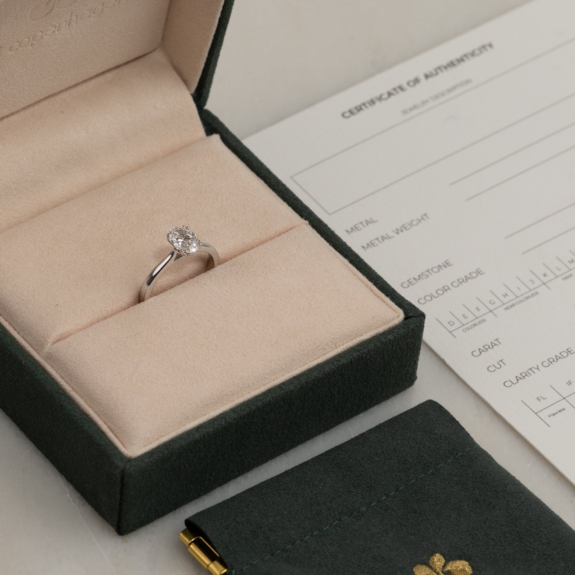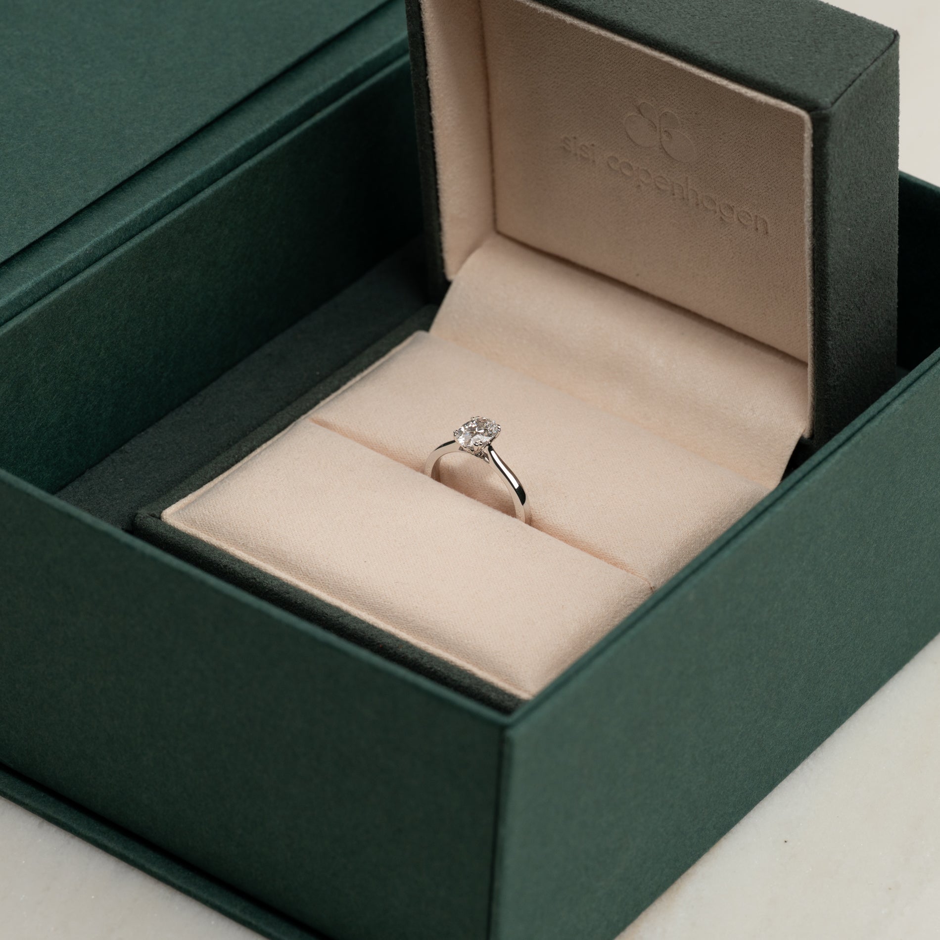 Ringen leveres i vår eksklusive Diamond Collection-boks med smykkeeske, sertifikat og pouch. Boksen er vakkert knyttet med gavebånd og er perfekt dersom ringen skal gis i gave. Diamanten leveres med IGI-sertifikat.