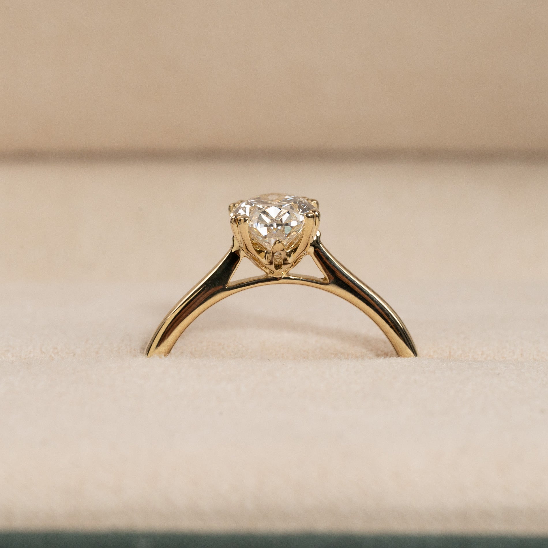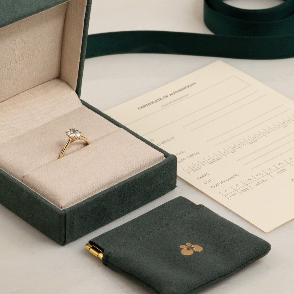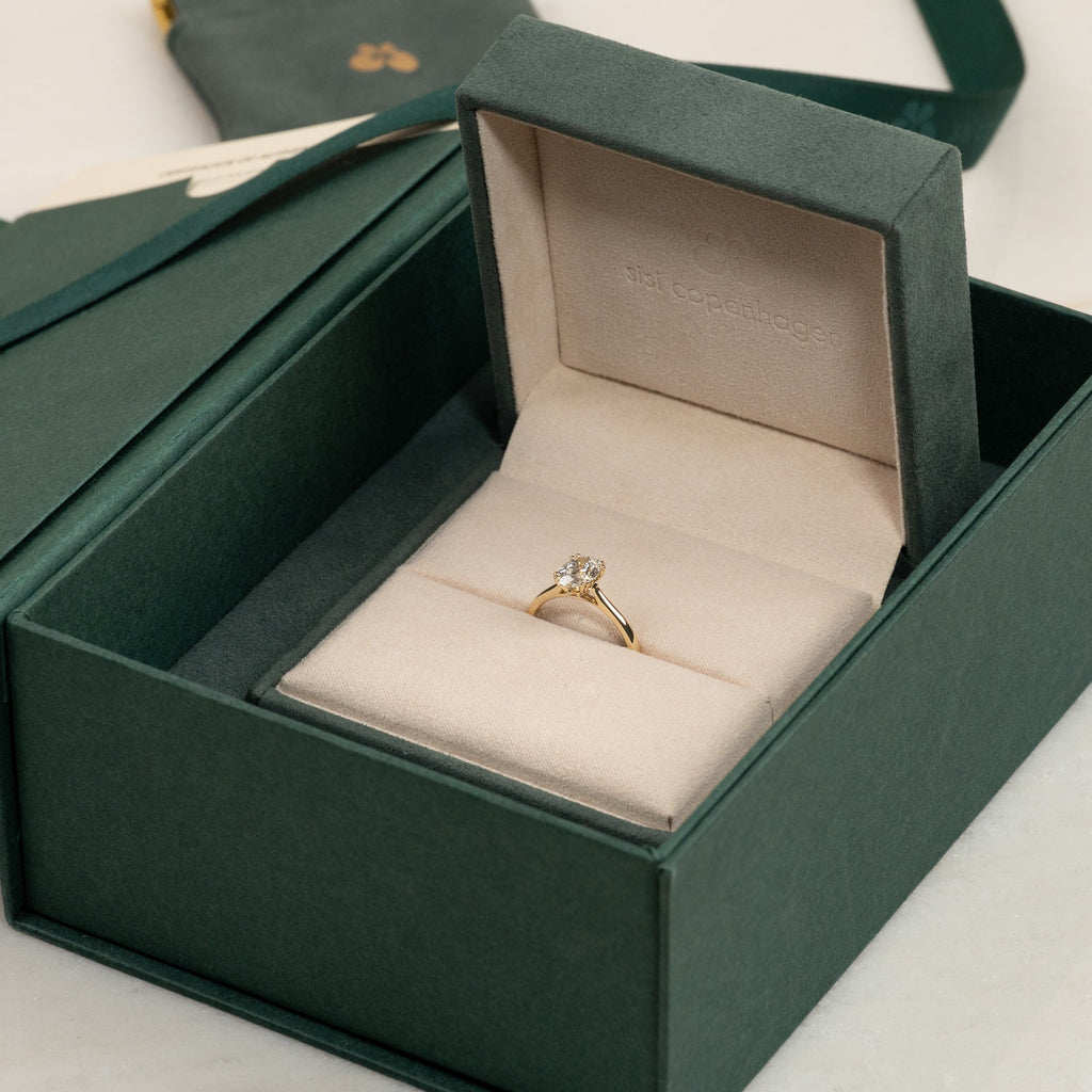 Ringen er laget i 14 karat massivt gull med en laboratoriedyrket diamant på 1,5 ct. i farge E-F (River) og klarhet VVS. Smykket er laget med omtanke; diamantene er laget med solenergi, og gullet er 100 % sertifisert resirkulert.