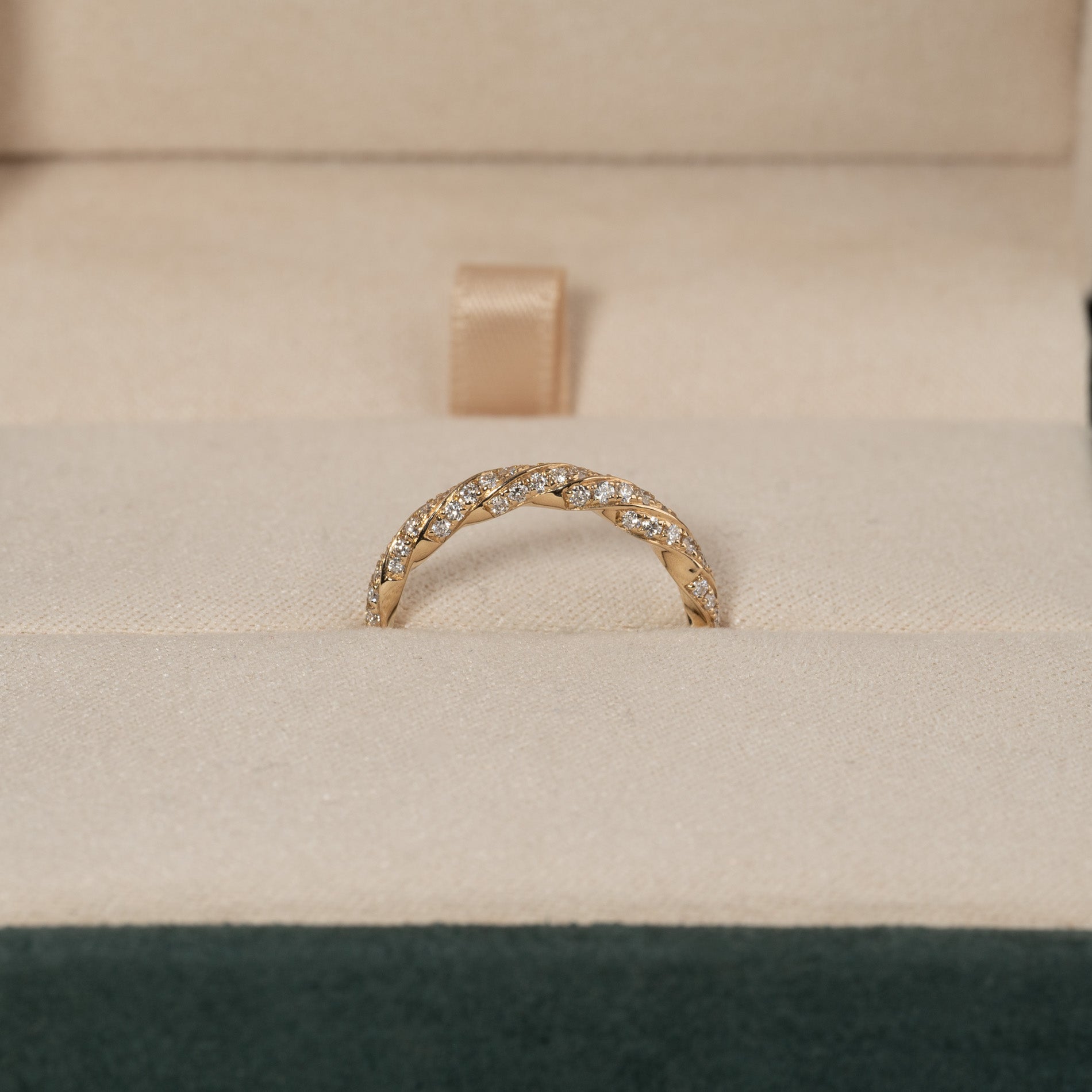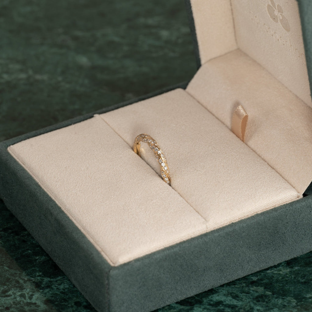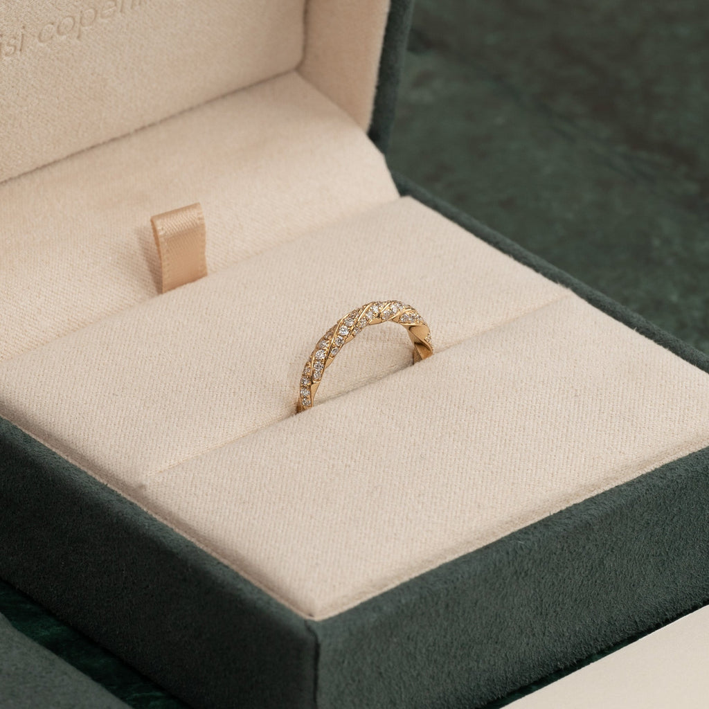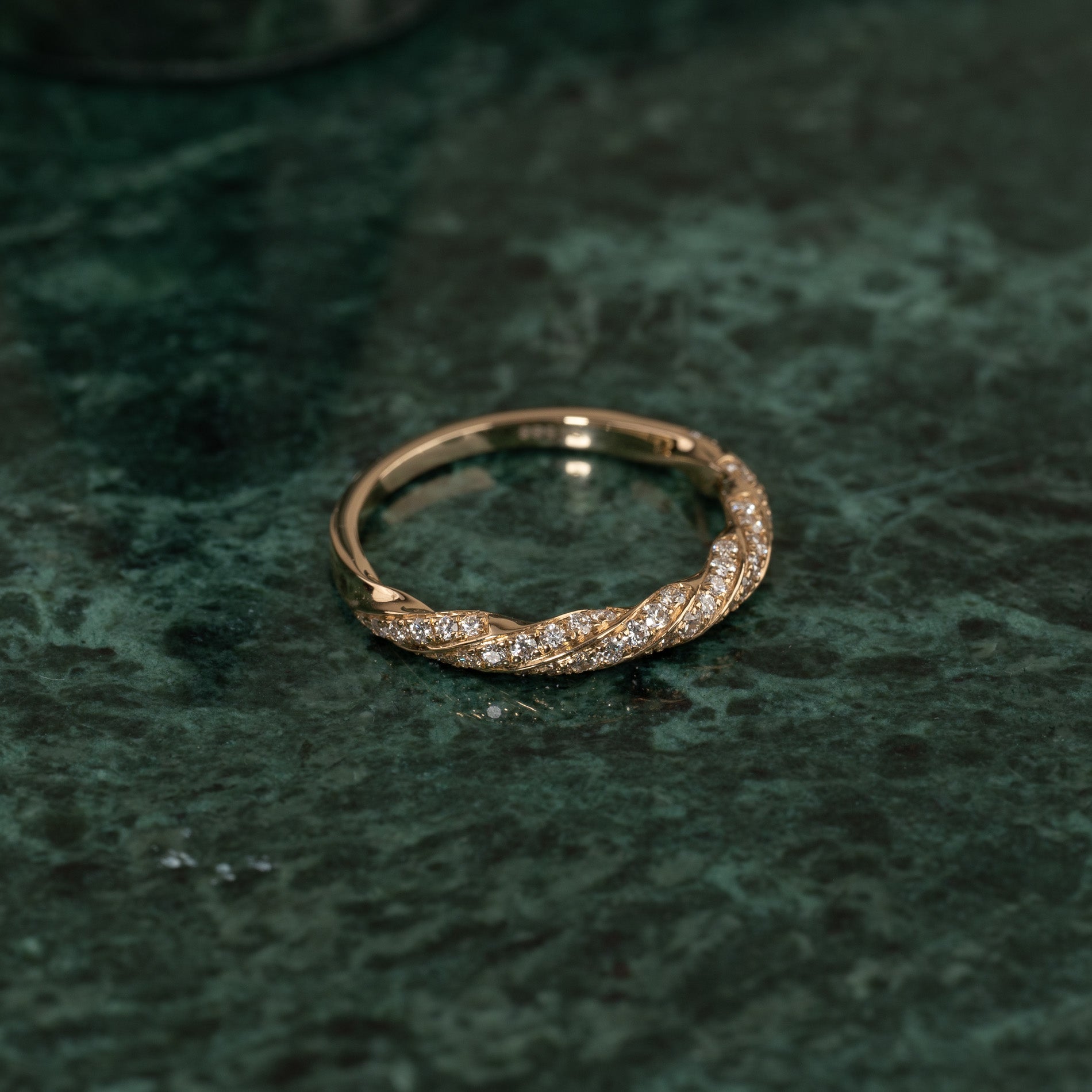 Allianceringen i 14 karat massivt gull med en 0,4 ct. lab-grown diamanter. Ringen består av 53 diamanter i graderte størrelser som ligger rundt hele oversiden av ringskinnen. Ringen er en moderne vri på den klassiske allianceringen, som gjør at den skiller seg ut og har et spennende og unikt uttrykk.