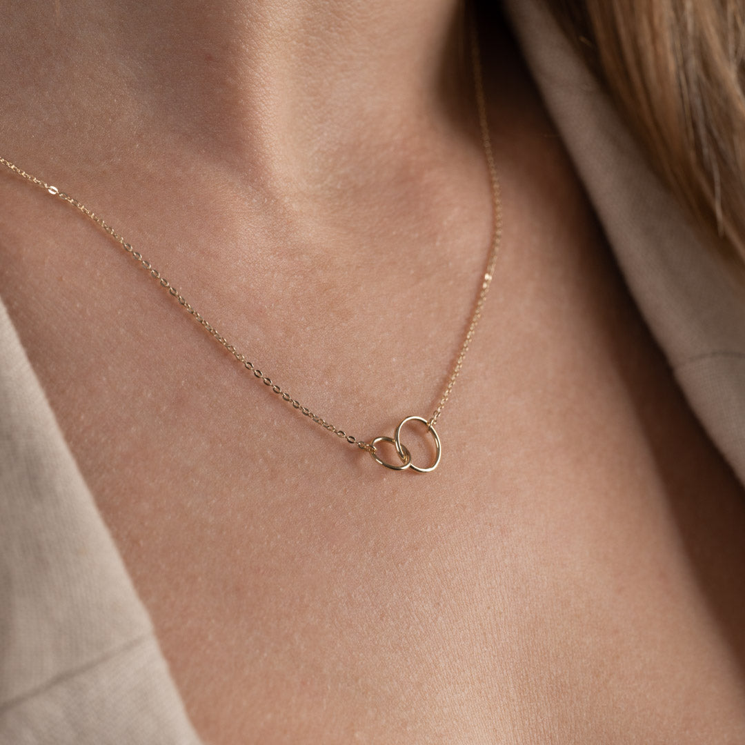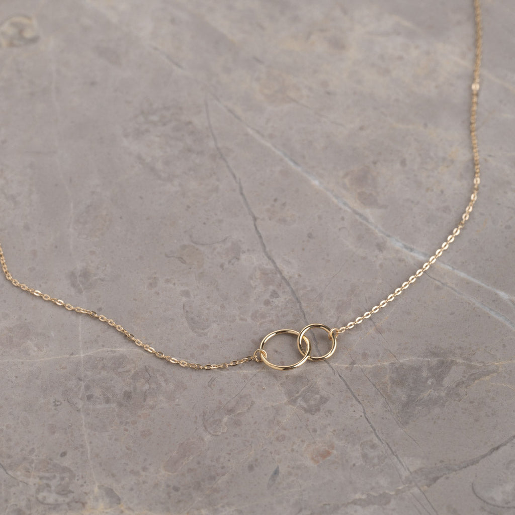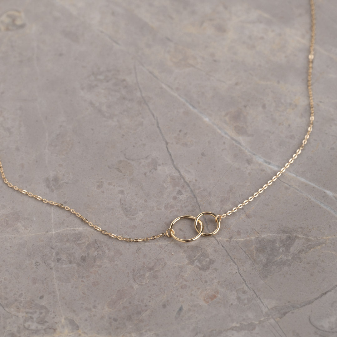 Vårt halskjede Una er laget i 100% resirkulert 9 karat massivt gull. Halskjedet er et klassisk ankerkjede, der to sammenkoblede ringer danner en fin symbolsk detalj midt på halskjedet.