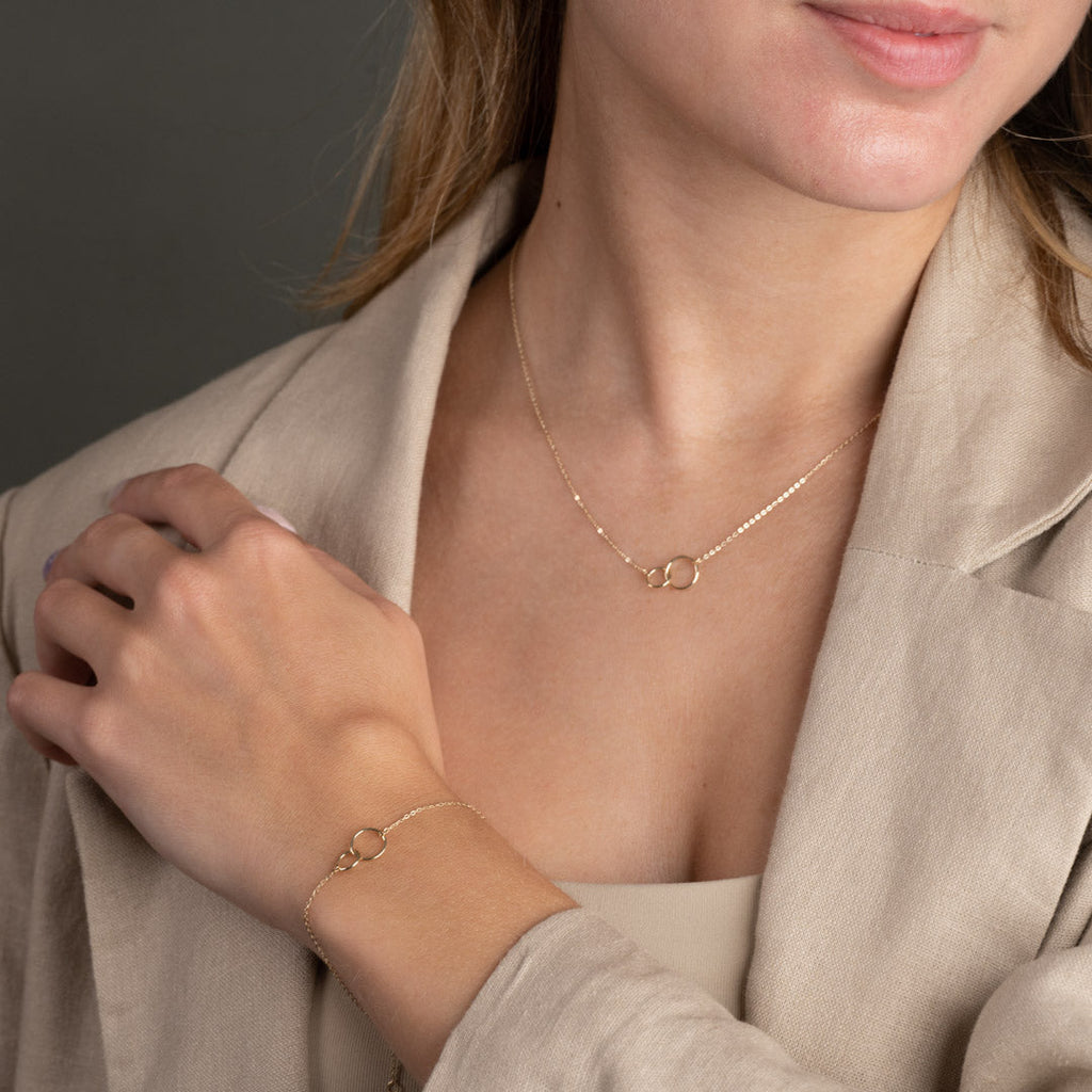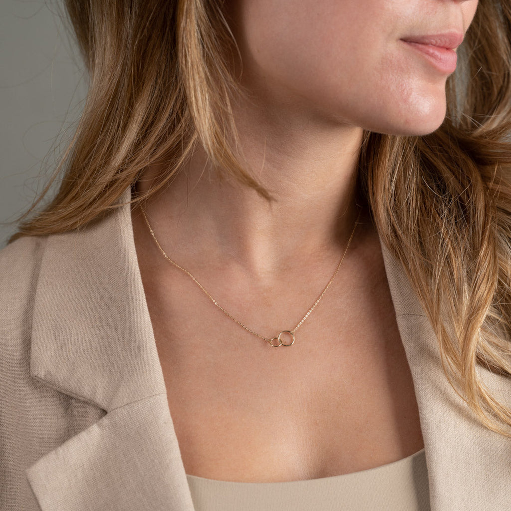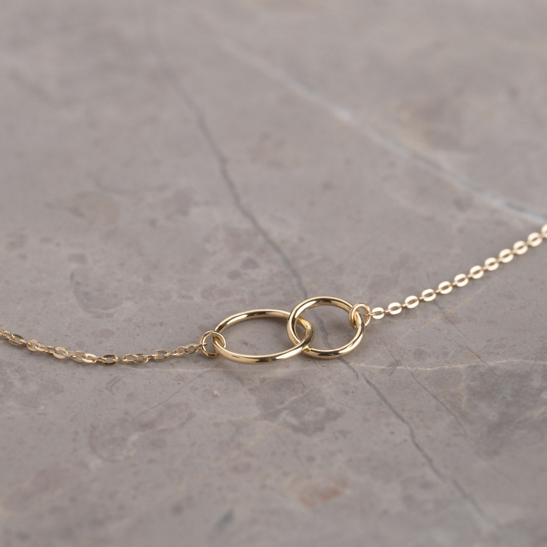 Vårt halskjede Una er laget i 100% resirkulert 9 karat massivt gull. Halskjedet er et klassisk ankerkjede, der to sammenkoblede ringer danner en fin symbolsk detalj midt på halskjedet.