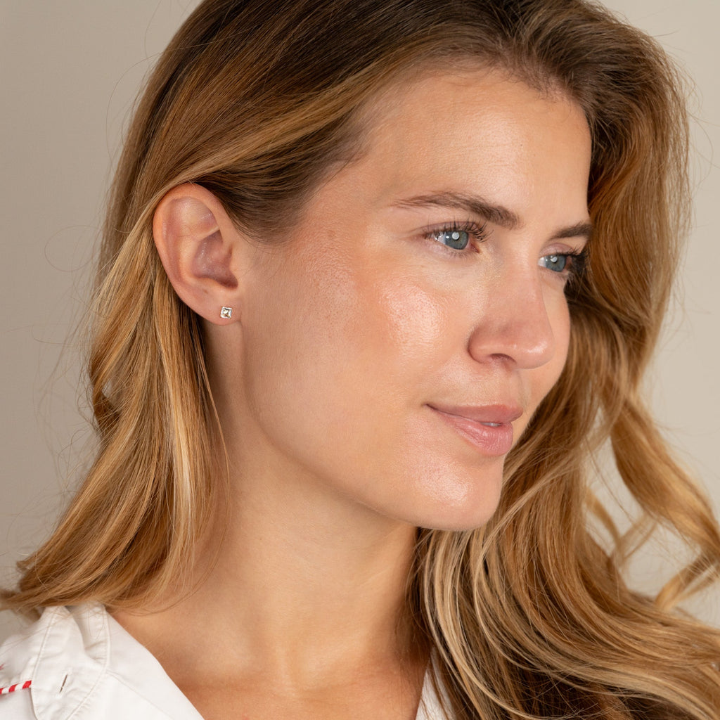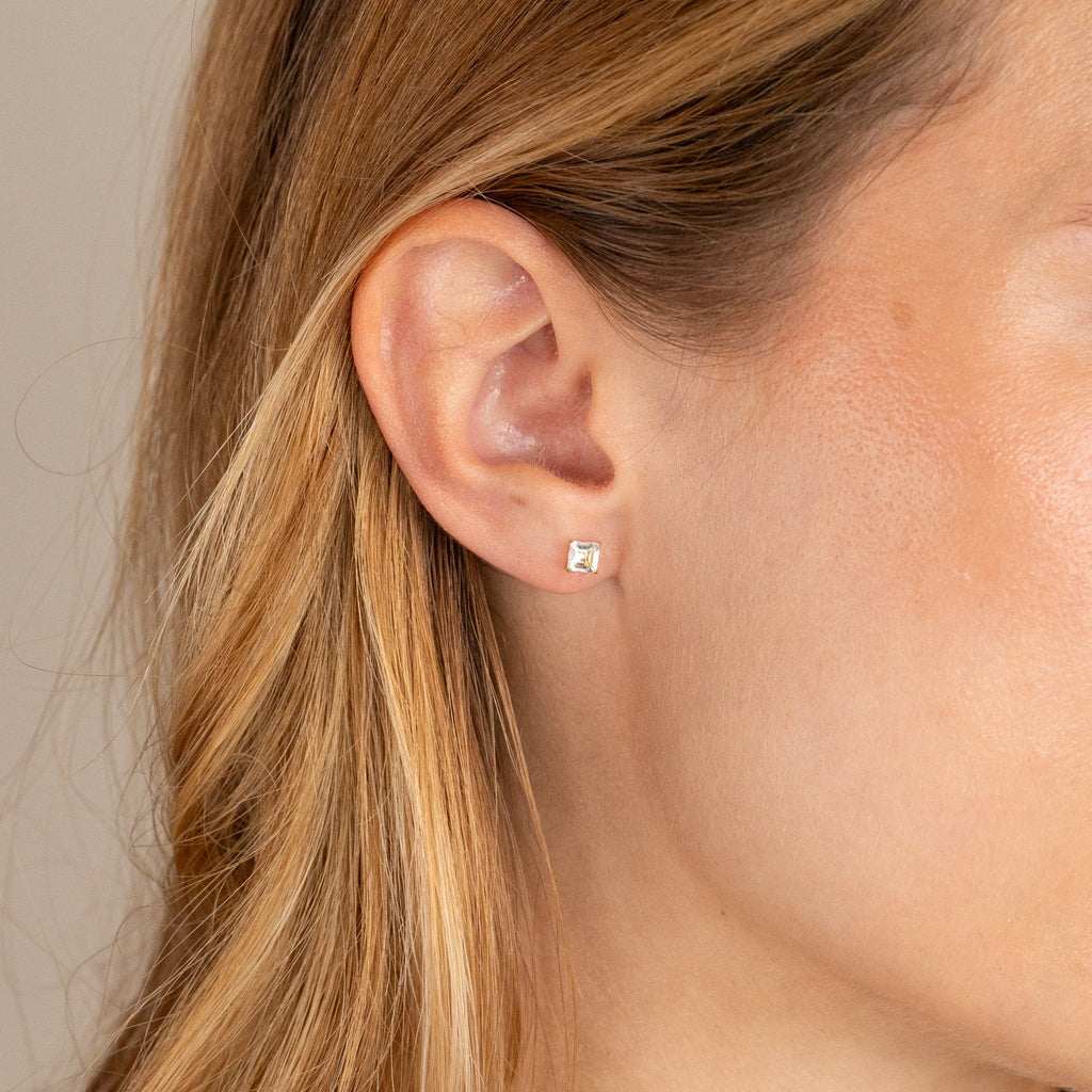 Øreringene er laget av 100% resirkulert 9 karat massivt gull. Stenene måler 4,6mm x 4,6mm. Disse øreringene er fine og klassiske med en fasettslipt hvit topas, som sitter i en klassisk omfatning, som gir smykket et feminint touch.