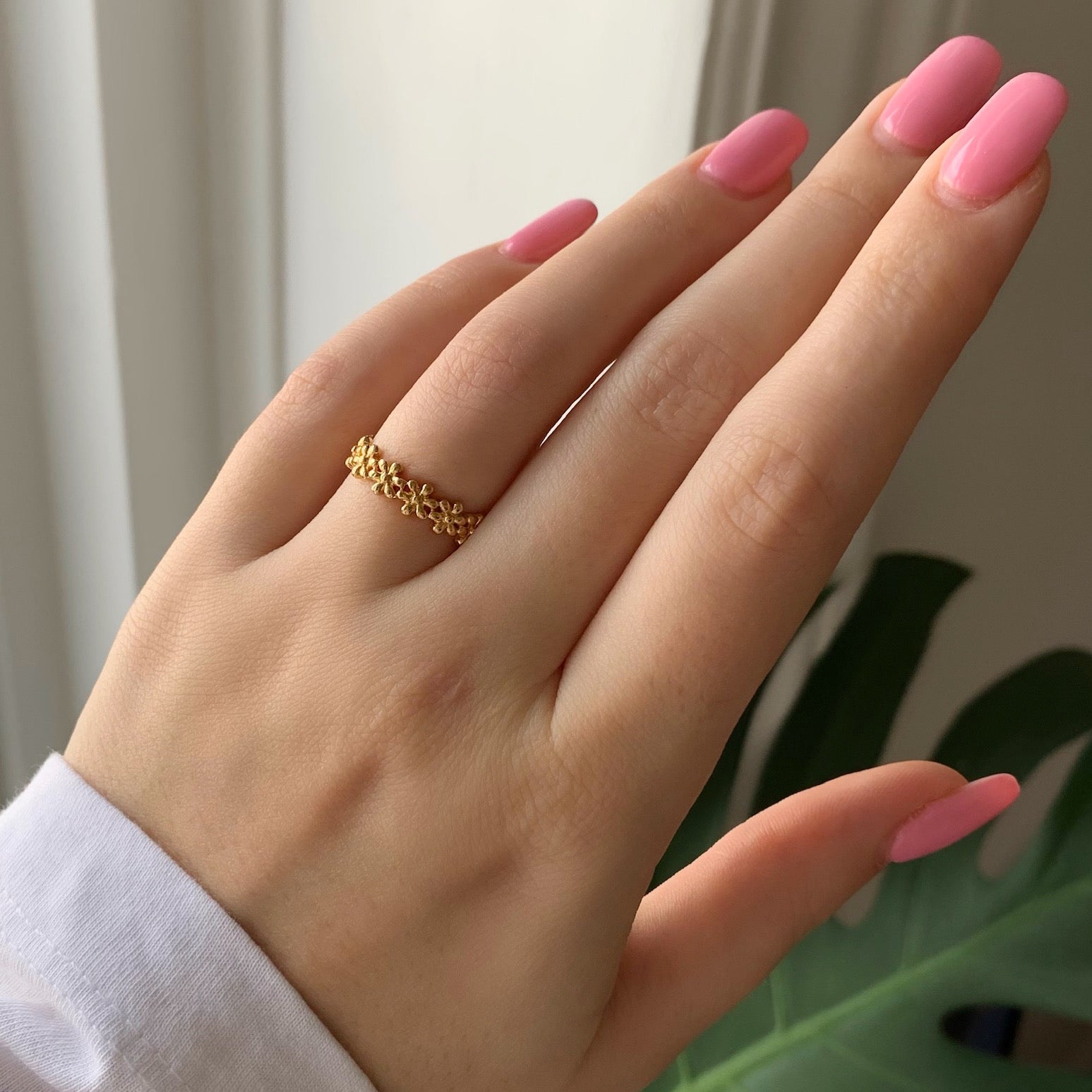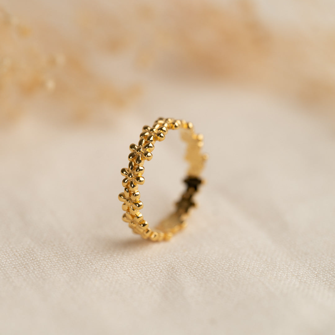 Ring i 18 karat forgylt 925 sterlingsølv. Ringen har fine og enkle blomster, som sitter hele veien rundt. Det gir smykket et enkelt og feminint uttrykk, som går godt til enhver anledning.