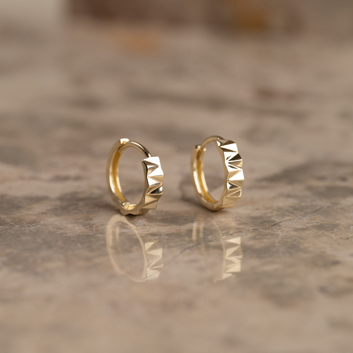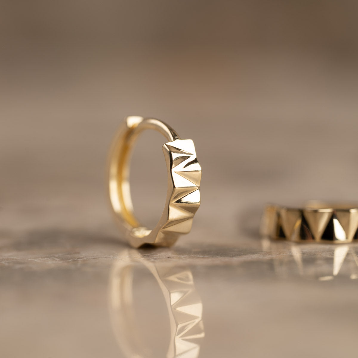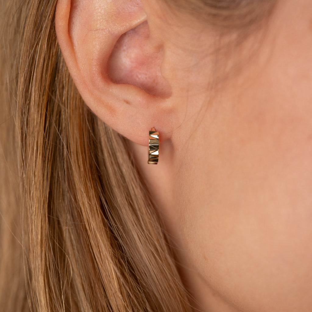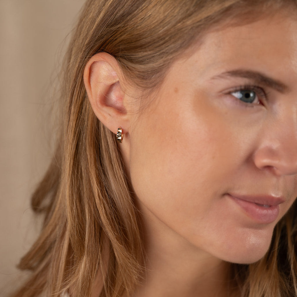 Våre Ziggy øreringer er laget av 100% resirkulert 9 karat massivt gull. Øreringene er utformet som hengslede creoler med klikk-lås. Overflaten er designet med inspirasjon fra origami, og ser ut som et tredimensionelt sikk-sakk mønster av trekantede flater. Det moderne uttrykket er fullt av spill og skinner i lyset.